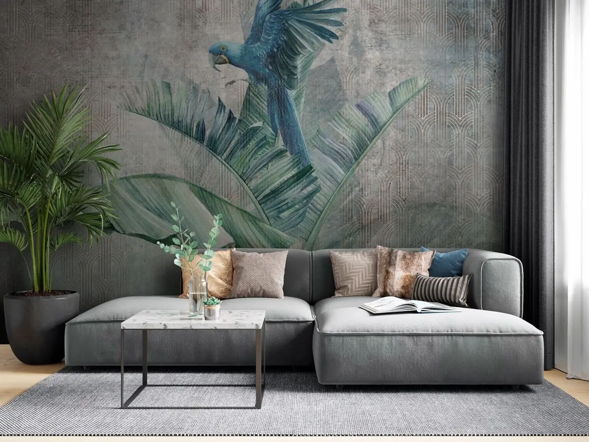 Fototapetak Nagy kék papagáj a banánfán, grunge beton textúrával Nr. u95432