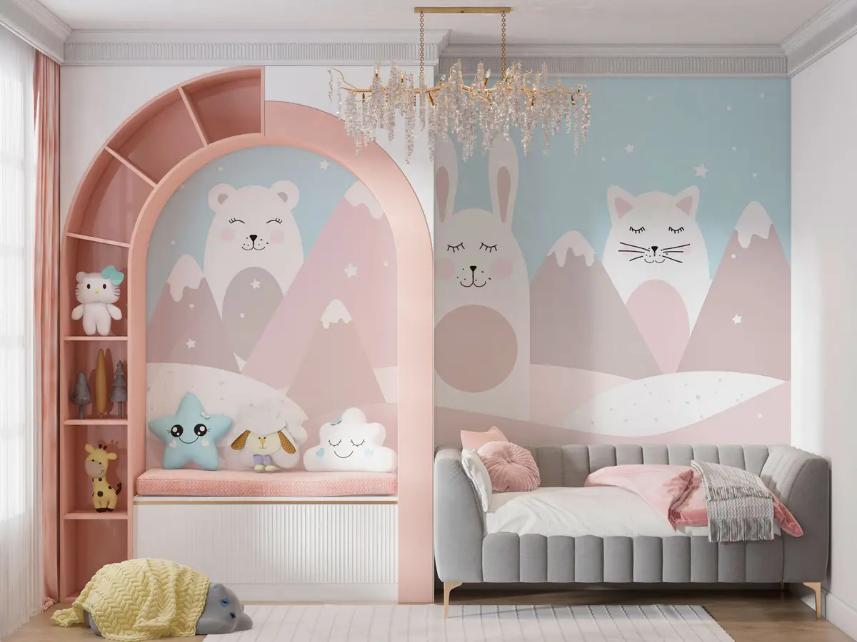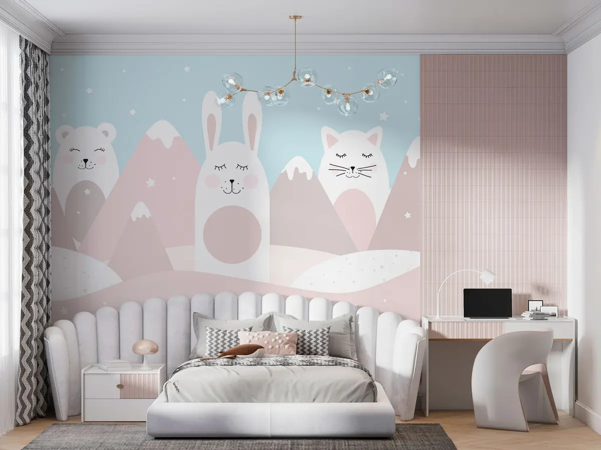 Fototapetak Nyúl, medve, róka a háttérben a bézs színű, hóval borított hegyek Nr. u98135