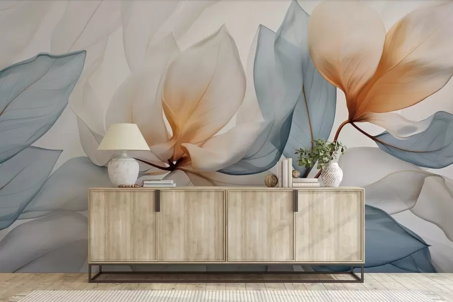 Fotótapéta Absztrakt áttetsző virágok, körök és geometriai alakzatok, pasztellkék, bézs és fehér színpaletta