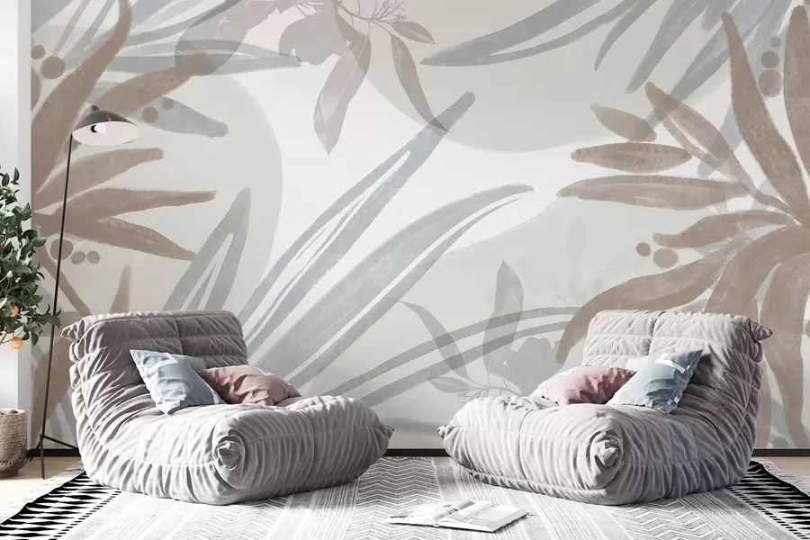 Fotótapéta Semleges tónusú absztrakt virágmintás, egymást átfedő levelekkel és formákkal a szürke , fehér és bézs árnyalataiban