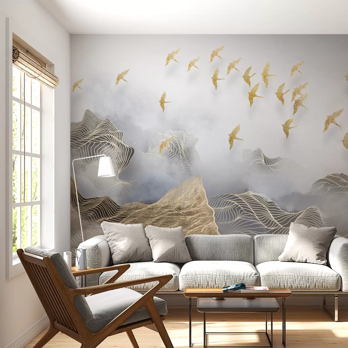 Fototapetak Egy csodálatos táj hegyekkel és madarakkal rajzolódik vékony vonalakból Nr. u44870