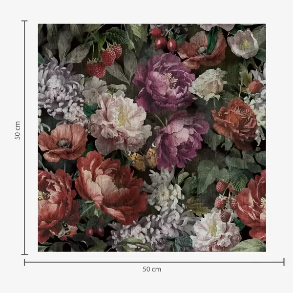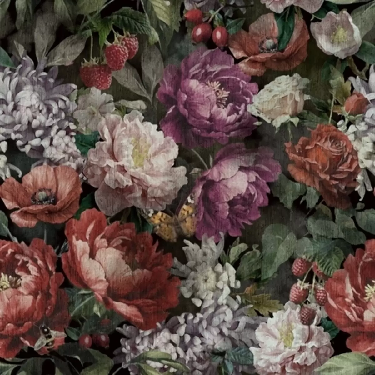 Fototapetak Sötét, drámai pünkösdi rózsák, bogyós gyümölcsök és pillangó fekete háttér előtt Nr. a00862