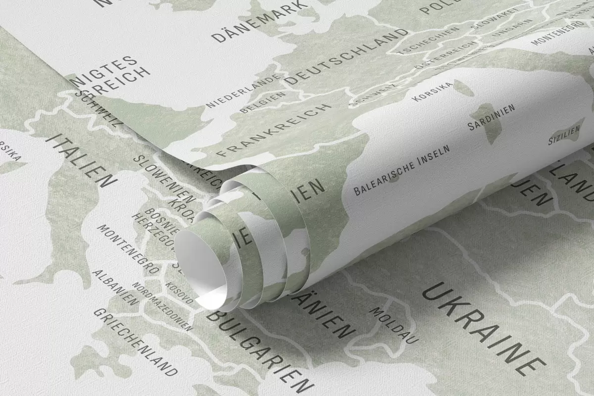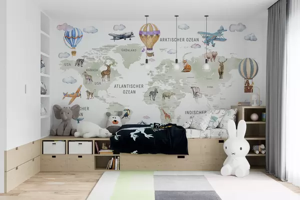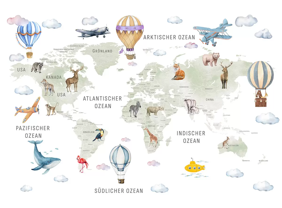 Fototapetak Gyerekeknek szóló, akvarell stílusú térkép állatokkal és hőlégballonokkal. Német nyelvű. Zöld színű. Nr. c00001de