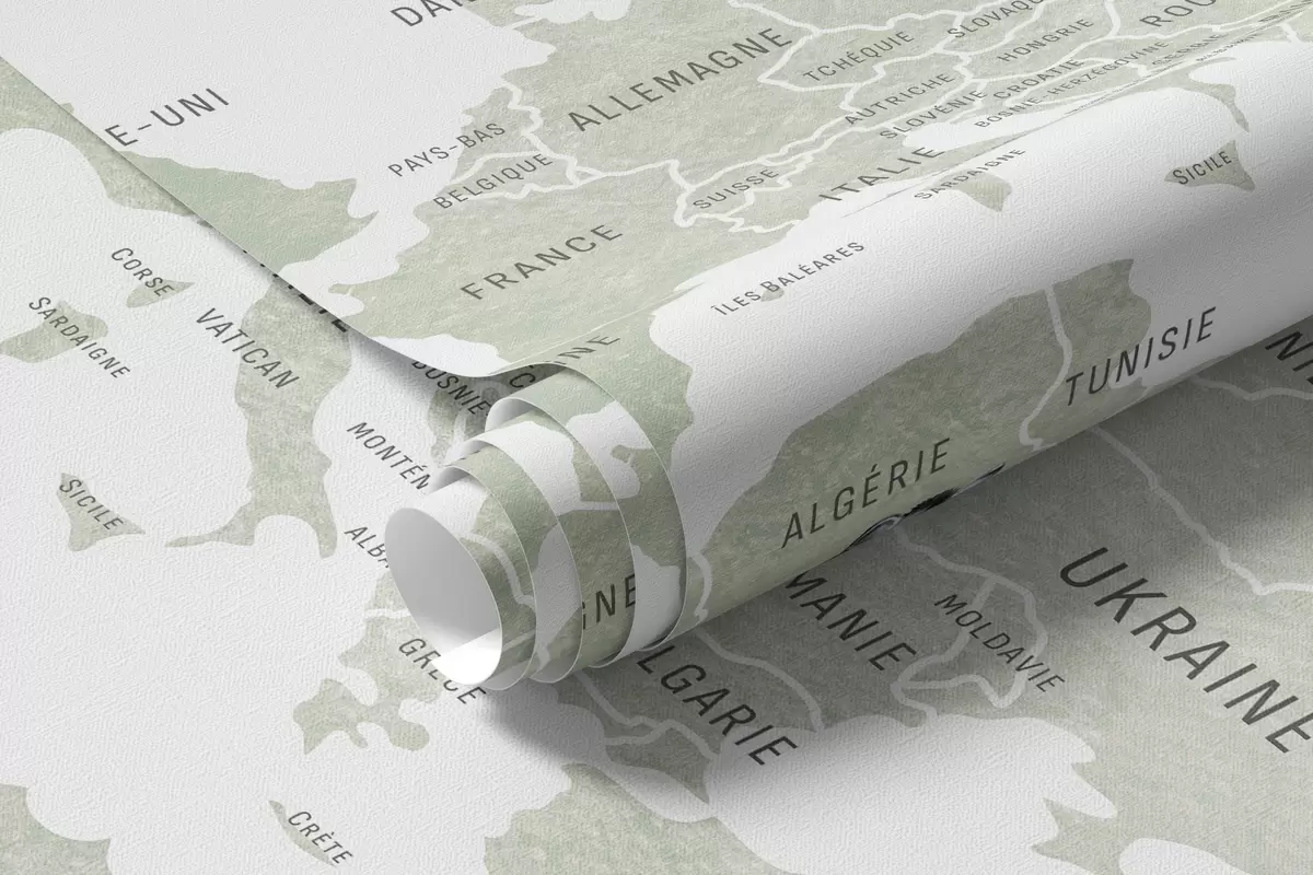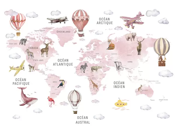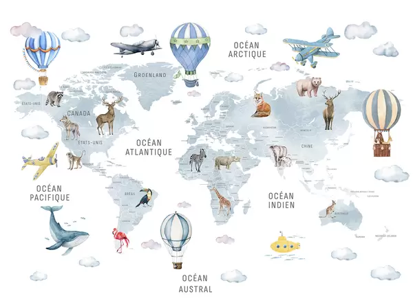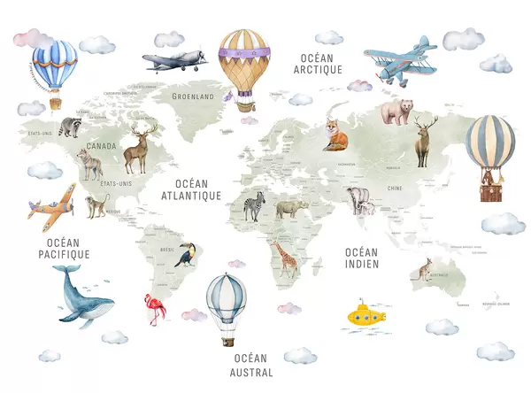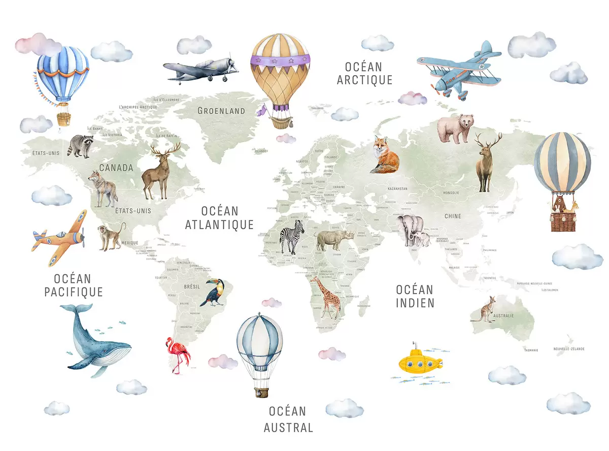 Fototapetak Gyerekeknek szóló, akvarell stílusú térkép állatokkal és hőlégballonokkal. Francia nyelvű. Zöld színű. Nr. c00001fr