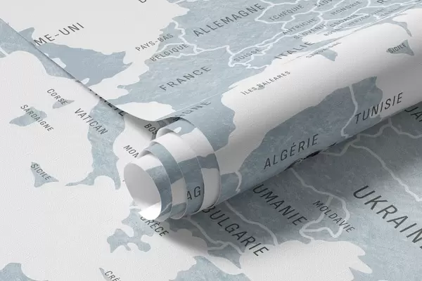 Fototapetak Gyerekeknek szóló, akvarell stílusú térkép állatokkal és hőlégballonokkal. Francia nyelvű. Kék színű. Nr. c00001frv1