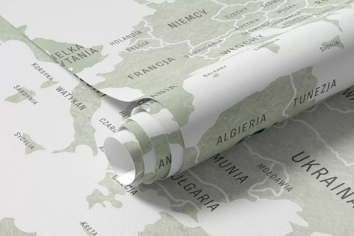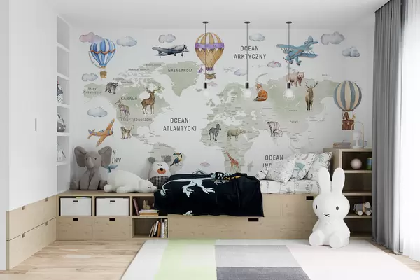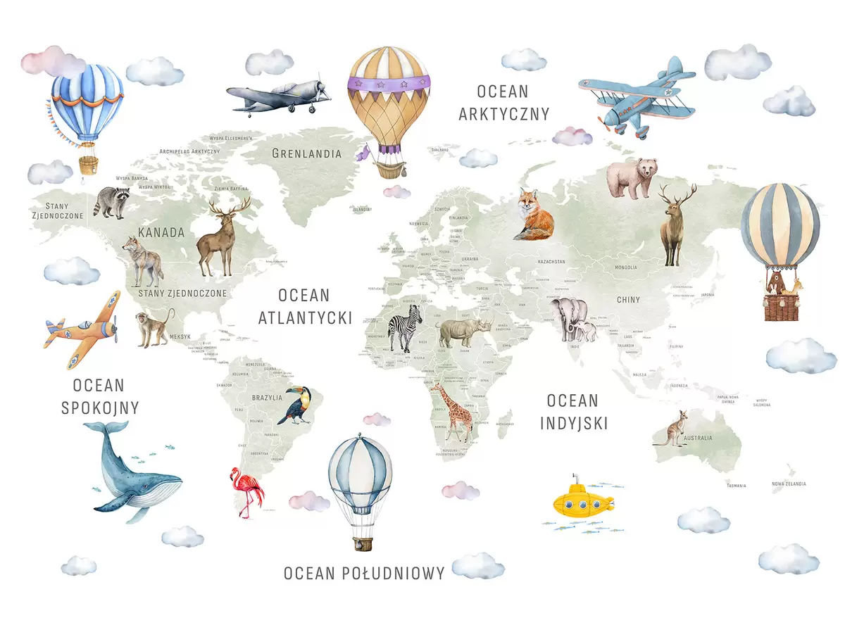 Fototapetak Gyerekeknek szóló, akvarell stílusú térkép állatokkal és hőlégballonokkal. Lengyel nyelvű. Zöld színű. Nr. c00001pl