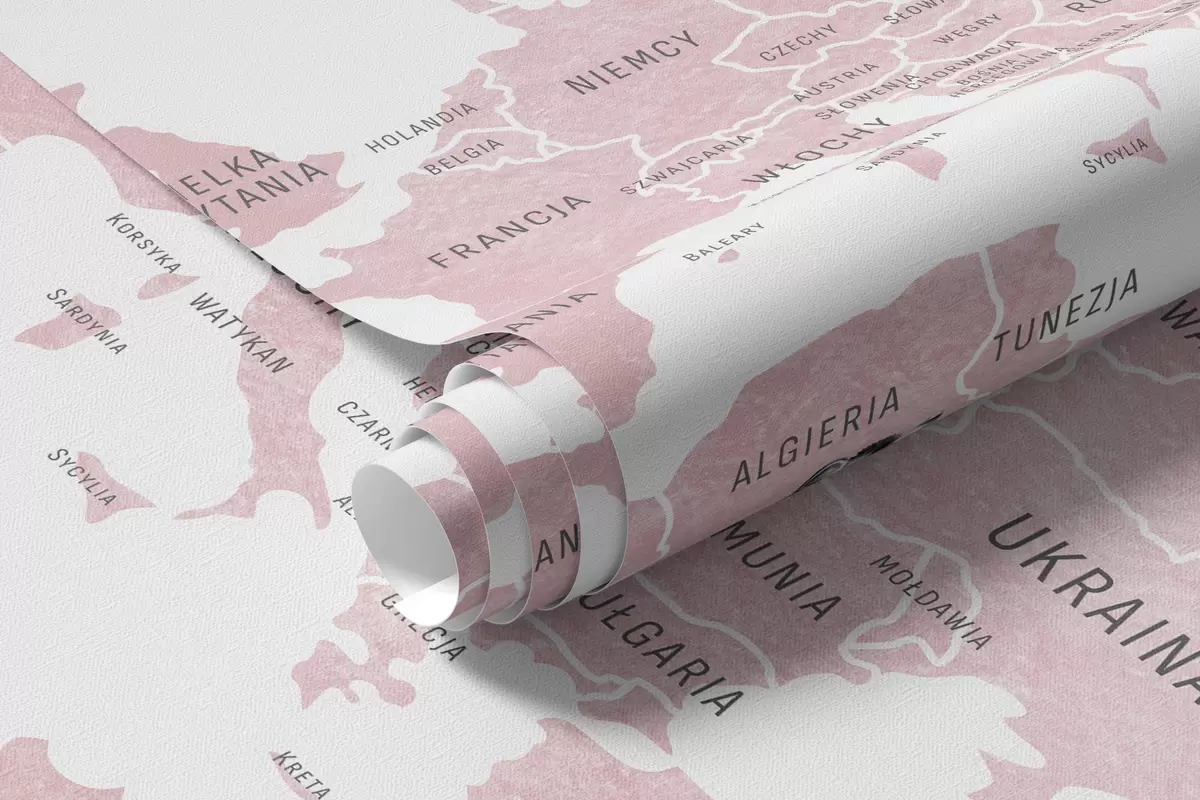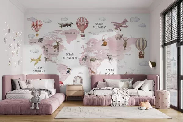 Fototapetak Gyerekeknek szóló, akvarell stílusú térkép állatokkal és hőlégballonokkal. Lengyel nyelvű. Rózsaszín. Nr. c00001plv3