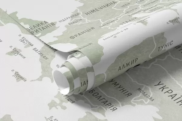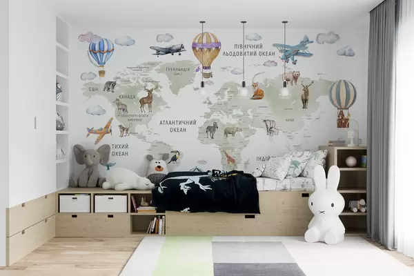 Fototapetak Gyerekeknek szóló, akvarell stílusú térkép állatokkal és hőlégballonokkal. Ukrán nyelvű. Zöld színű. Nr. c00001uk