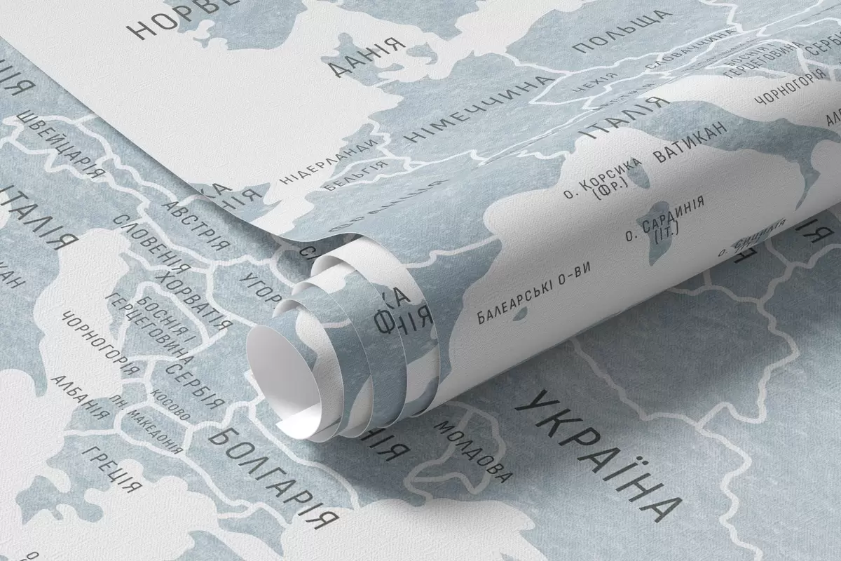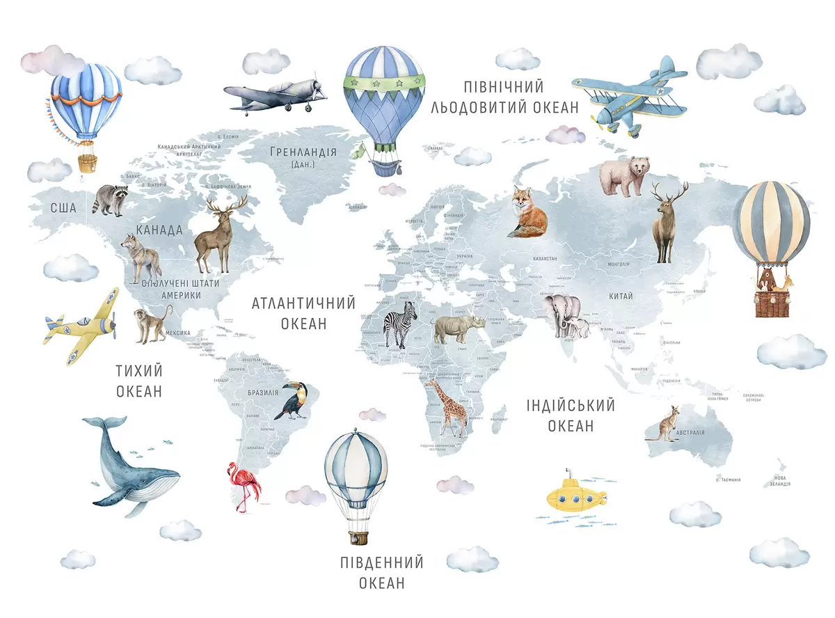Fototapetak Gyerekeknek szóló, akvarell stílusú térkép állatokkal és hőlégballonokkal. Ukrán nyelvű. Kék színű. Nr. c00001ukv1