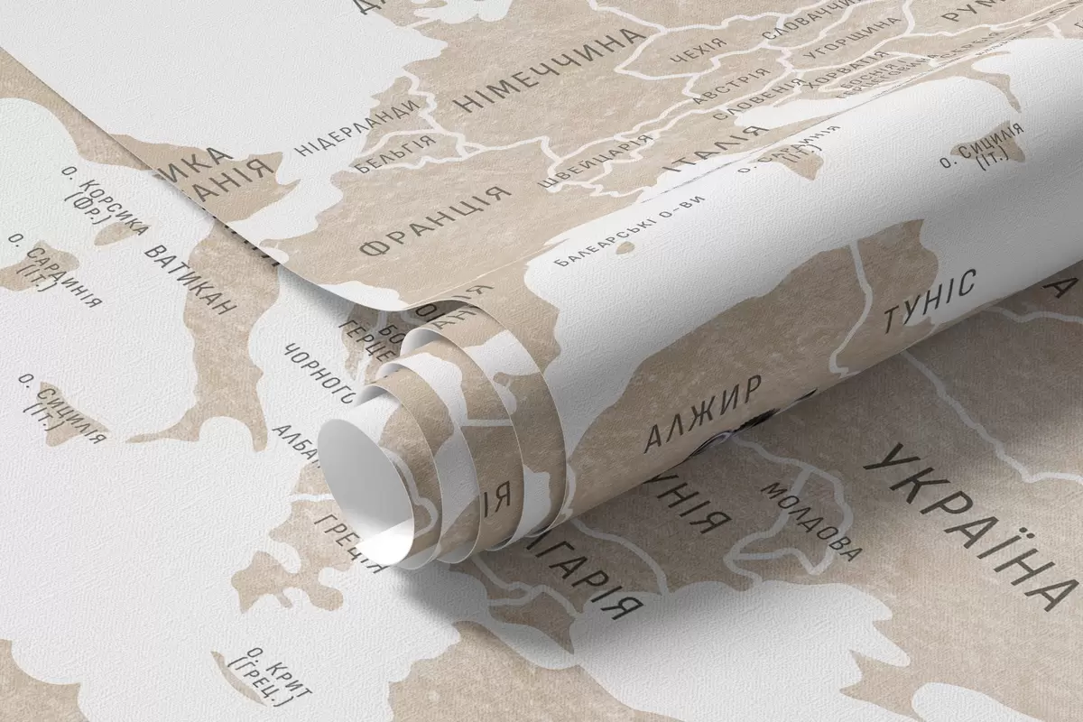 Fototapetak Gyerekeknek szóló, akvarell stílusú térkép állatokkal és hőlégballonokkal. Ukrán nyelvű. Bézs színű. Nr. c00001ukv2