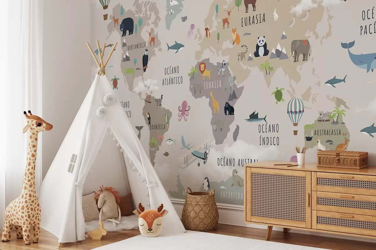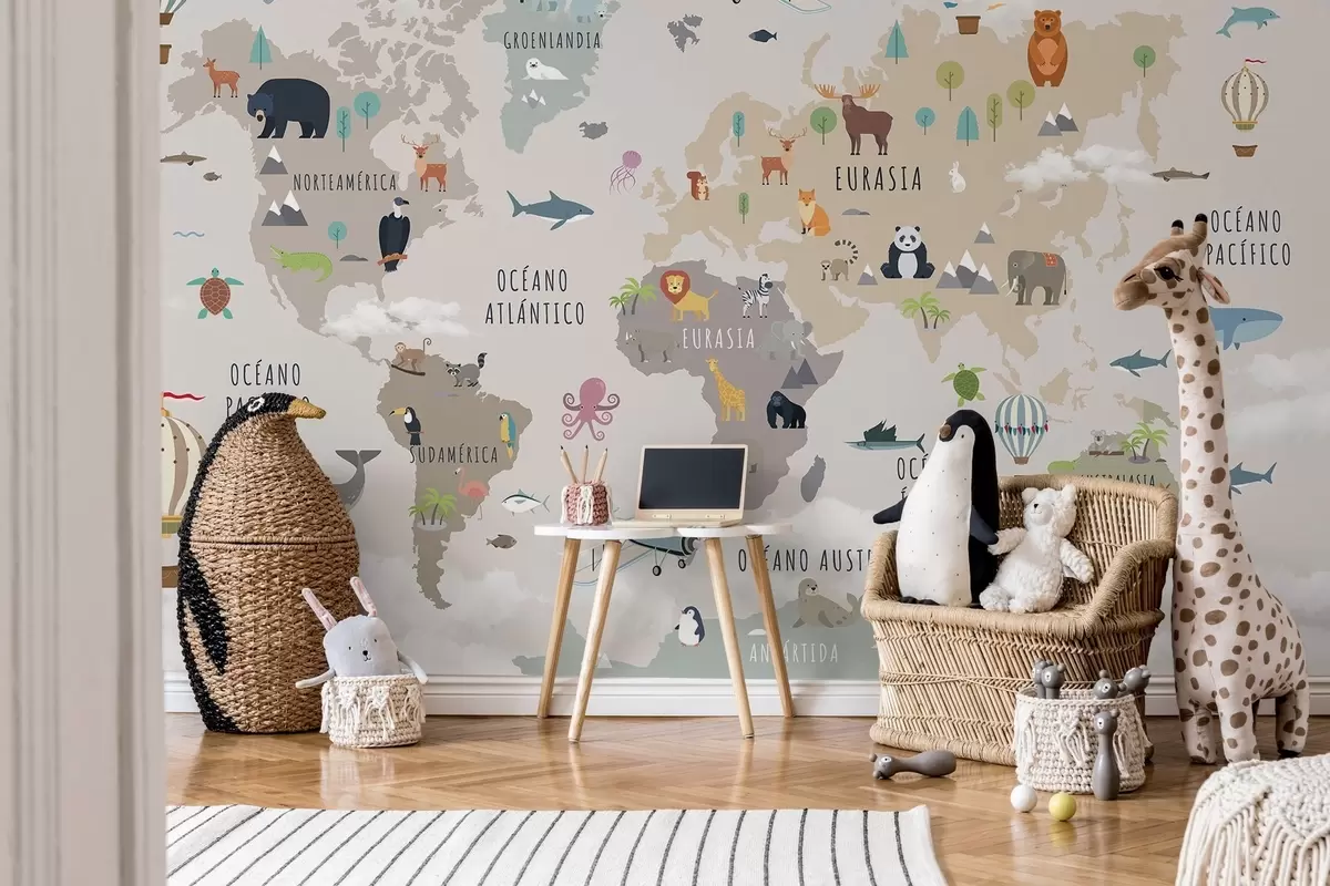 Fototapetak Gyerekek világtérképe állatokkal és hőlégballonokkal. Spanyol nyelv Nr. c00002es