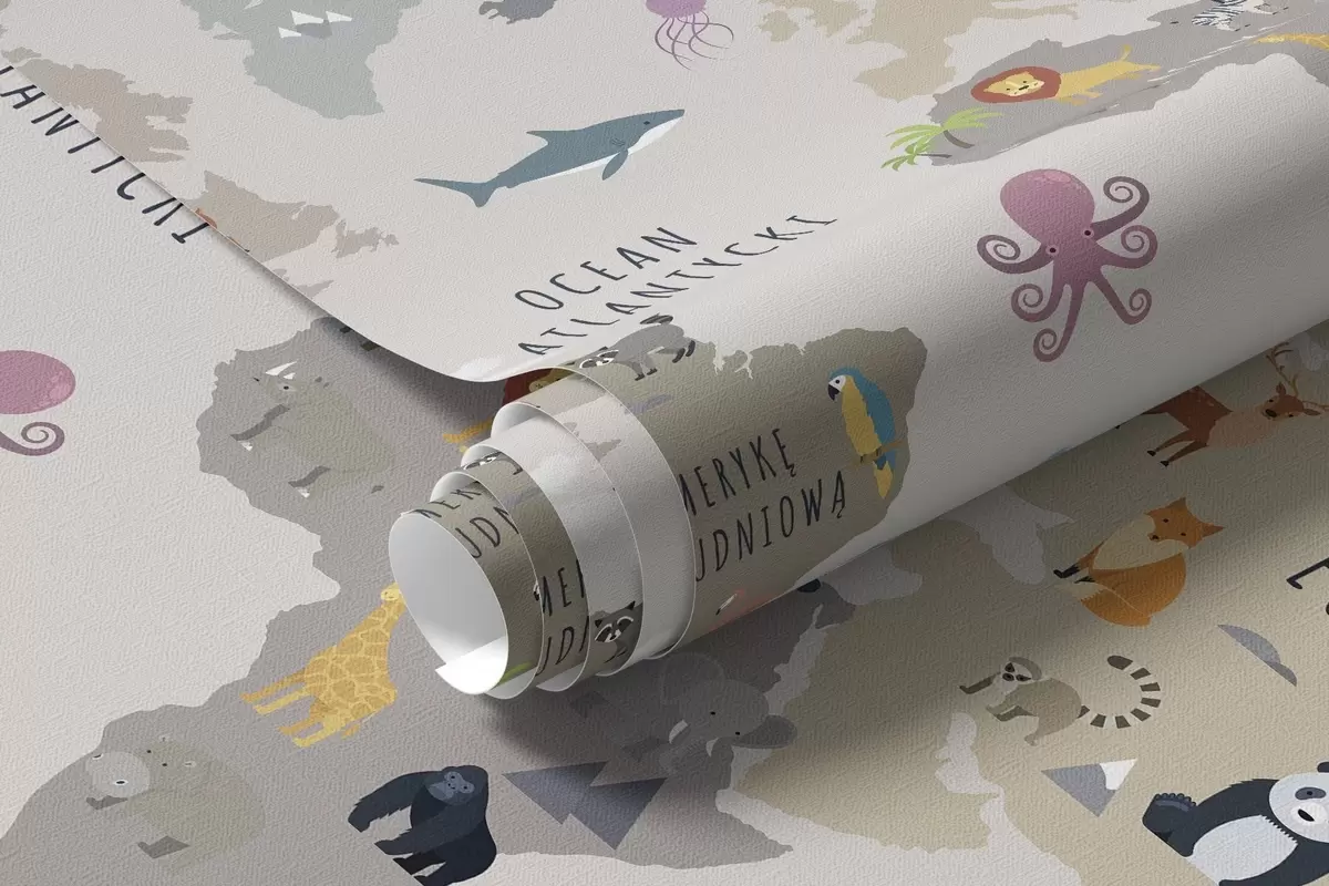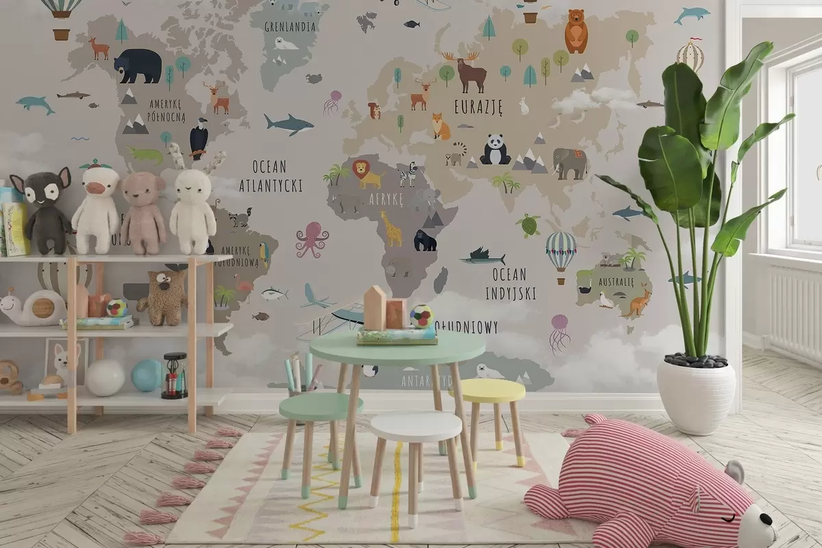 Fototapetak Gyerekek világtérképe állatokkal és hőlégballonokkal. Lengyel nyelv Nr. c00002pl
