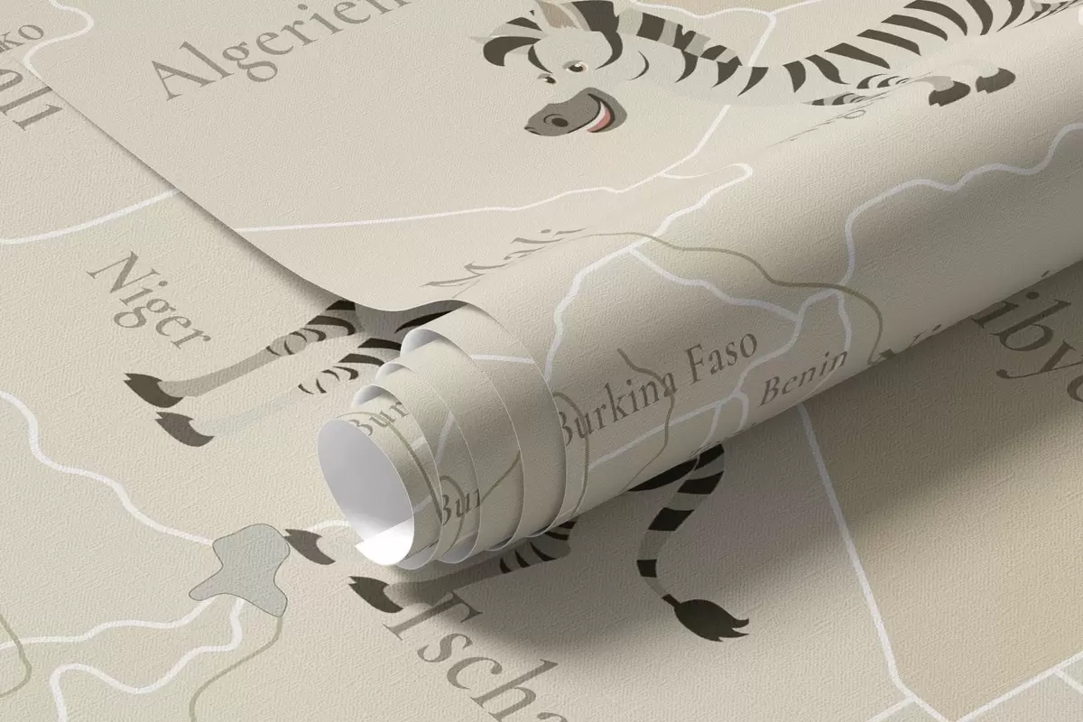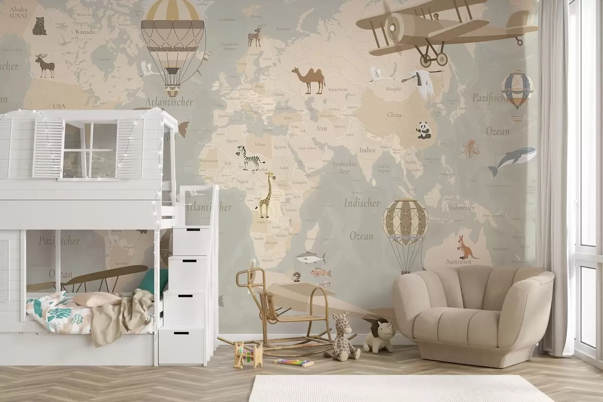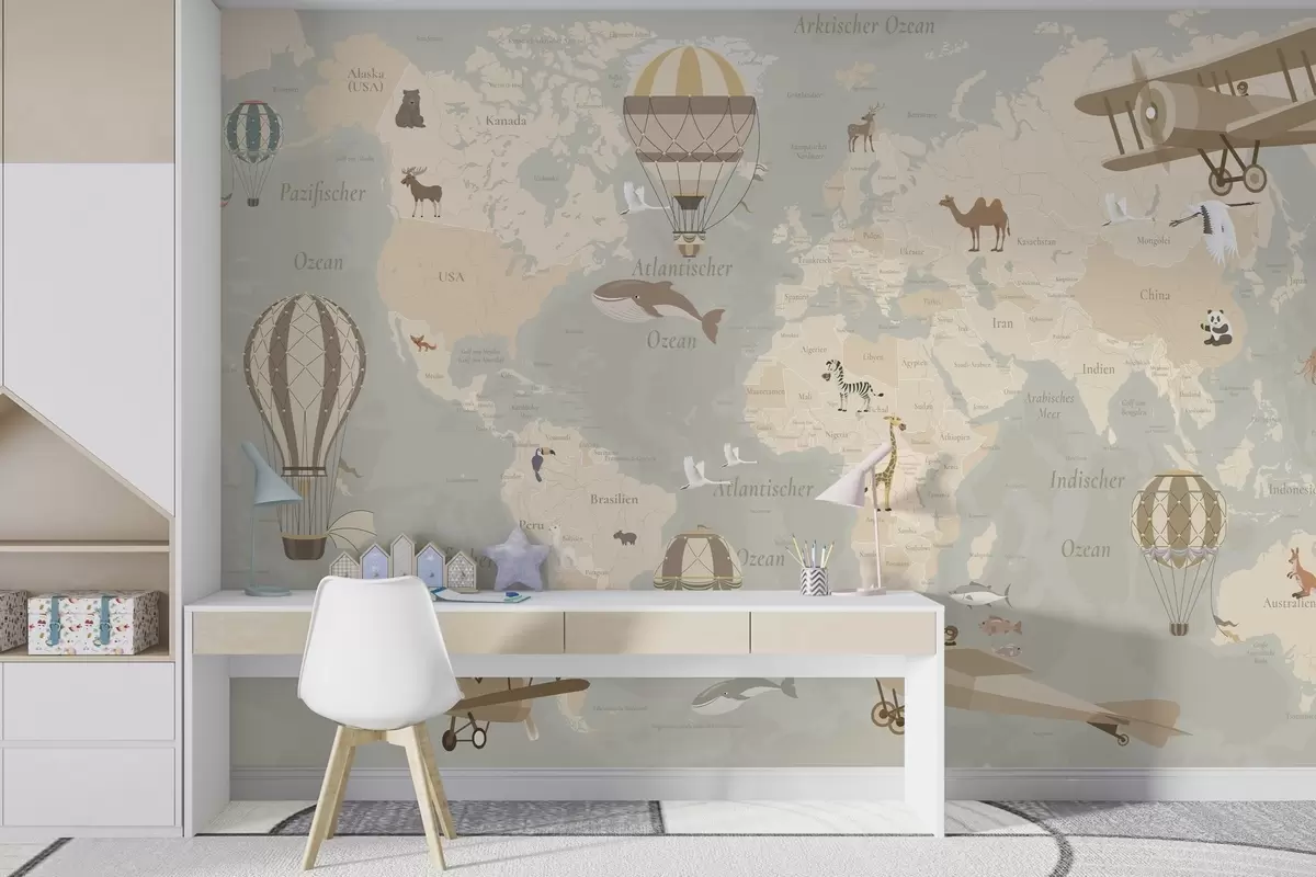 Fototapetak Gyerekeknek szóló világtérkép állatokkal, repülőgépekkel és hőlégballonokkal. Német nyelvű. Bézs színű Nr. c00003de