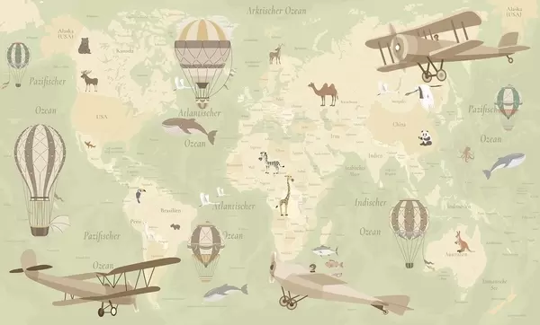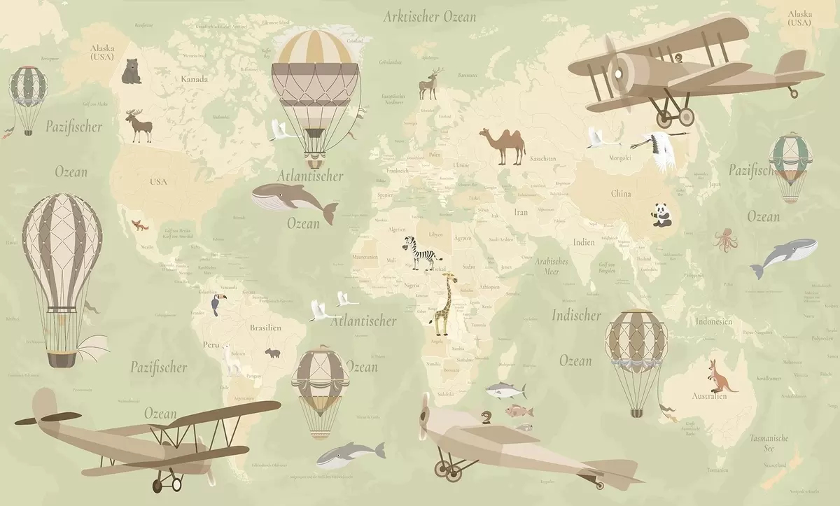 Fototapetak Gyerekeknek szóló világtérkép állatokkal, repülőgépekkel és hőlégballonokkal. Német nyelvű. Zöld színű. Nr. c00003dev2