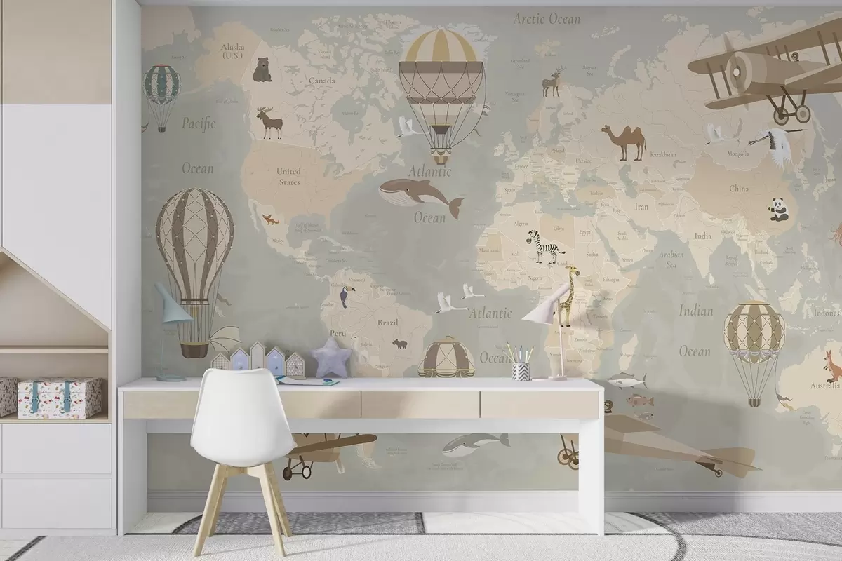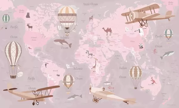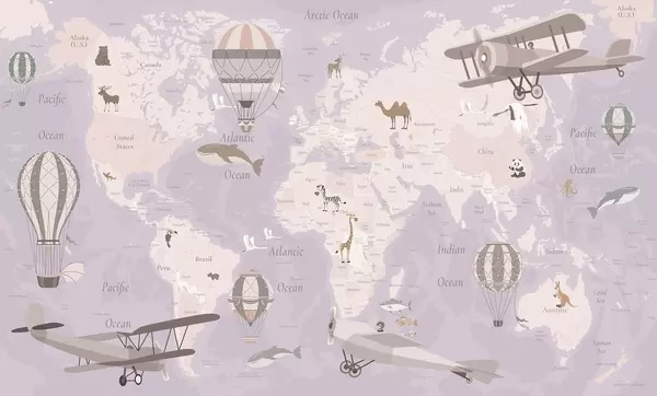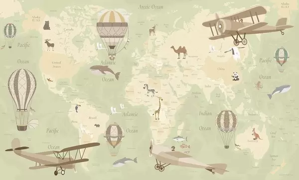 Fototapetak Gyerekek világtérképe állatokkal, repülőgépekkel és hőlégballonokkal. Angol nyelvű. Bézs színű. Nr. c00003en