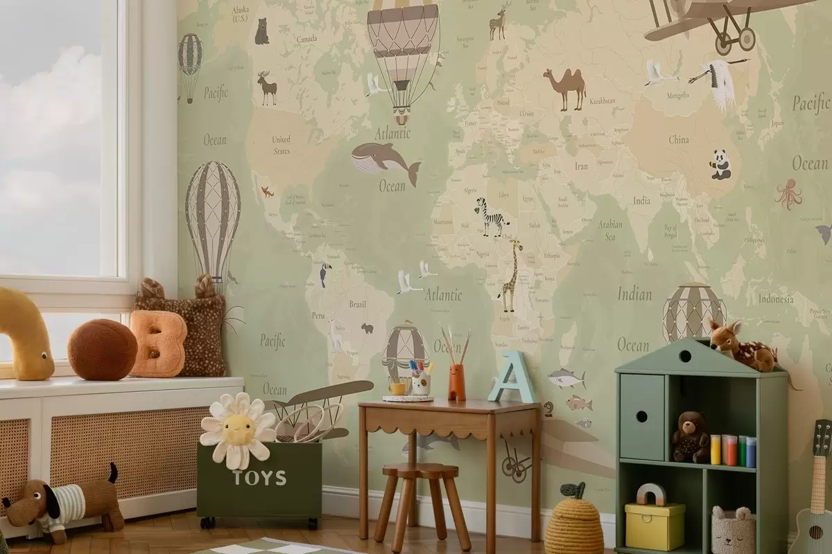 Fototapetak Gyerekek világtérképe állatokkal, repülőgépekkel és hőlégballonokkal. Angol nyelv. Zöld szín. Nr. c00003env2