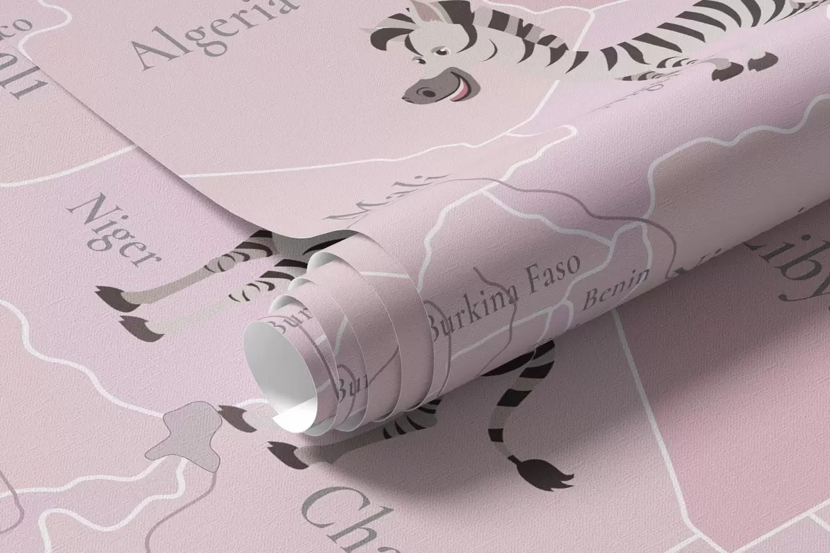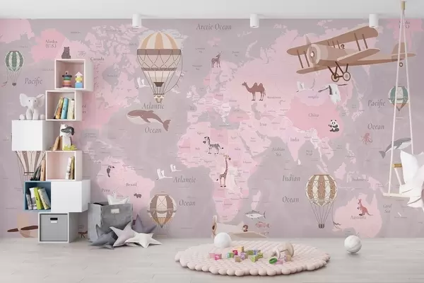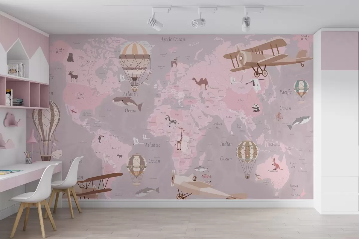 Fototapetak Gyerekek világtérképe állatokkal, repülőgépekkel és hőlégballonokkal. Angol nyelvű. Rózsaszín. Nr. c00003env3