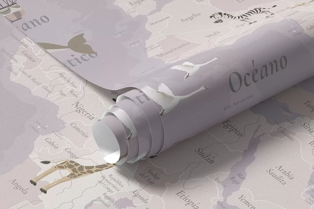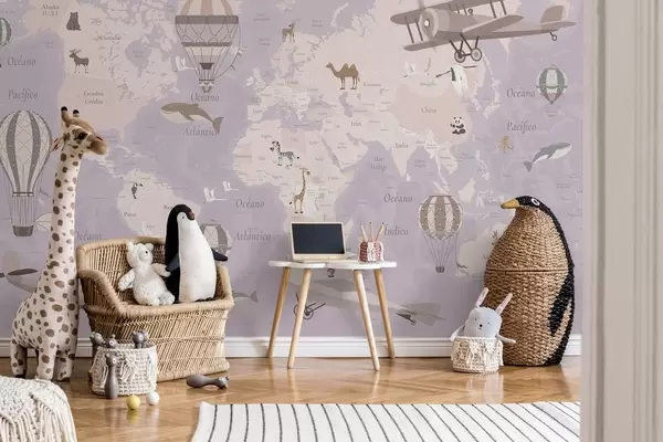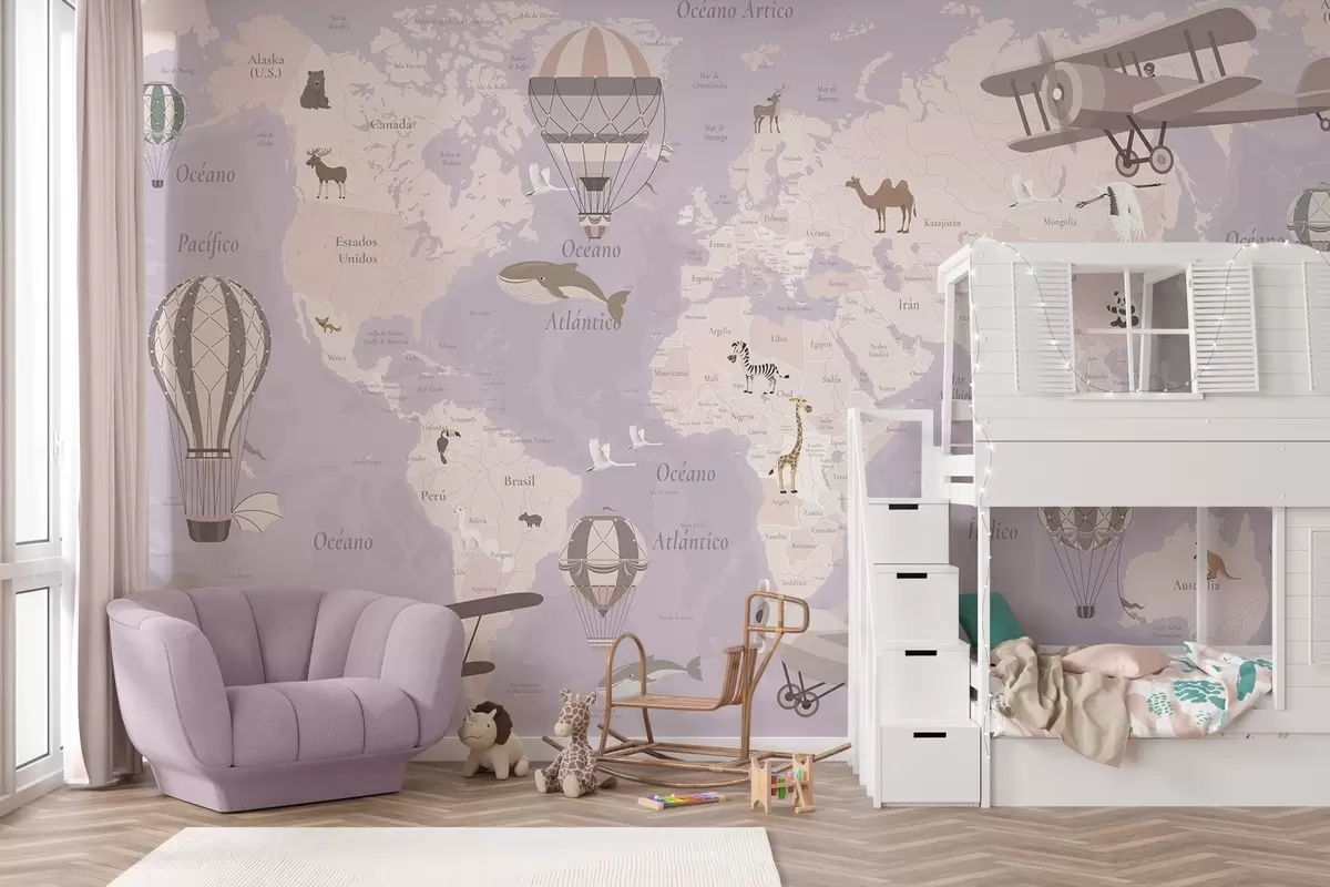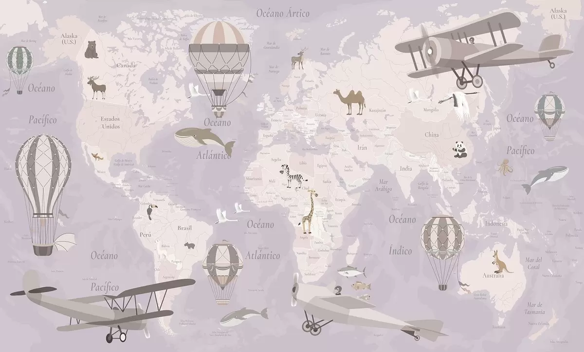 Fototapetak Gyerekek világtérképe állatokkal, repülőgépekkel és hőlégballonokkal. Spanyol nyelv. Lila szín. Nr. c00003esv4
