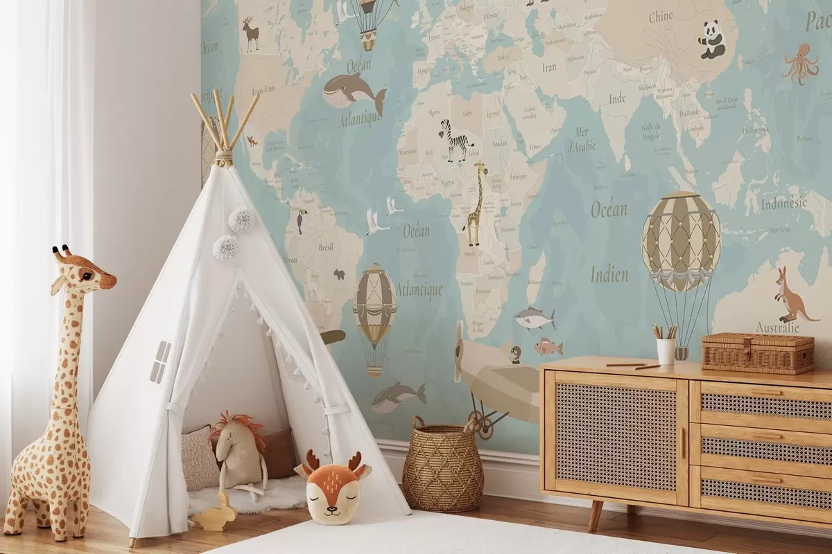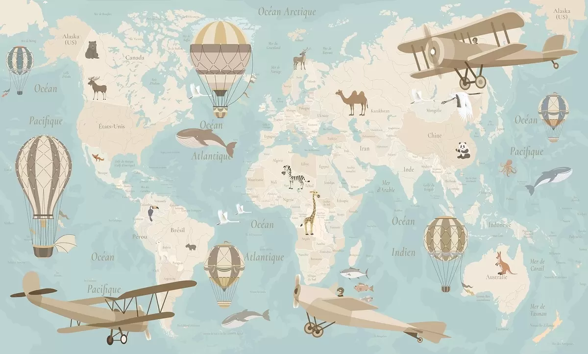 Fototapetak Gyerekek világtérképe állatokkal, repülőgépekkel és hőlégballonokkal. Francia nyelv. Kék szín. Nr. c00003frv1