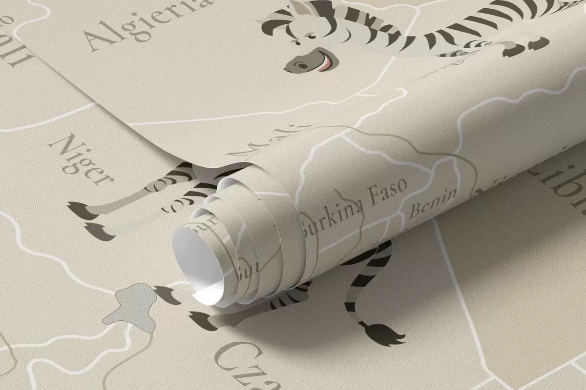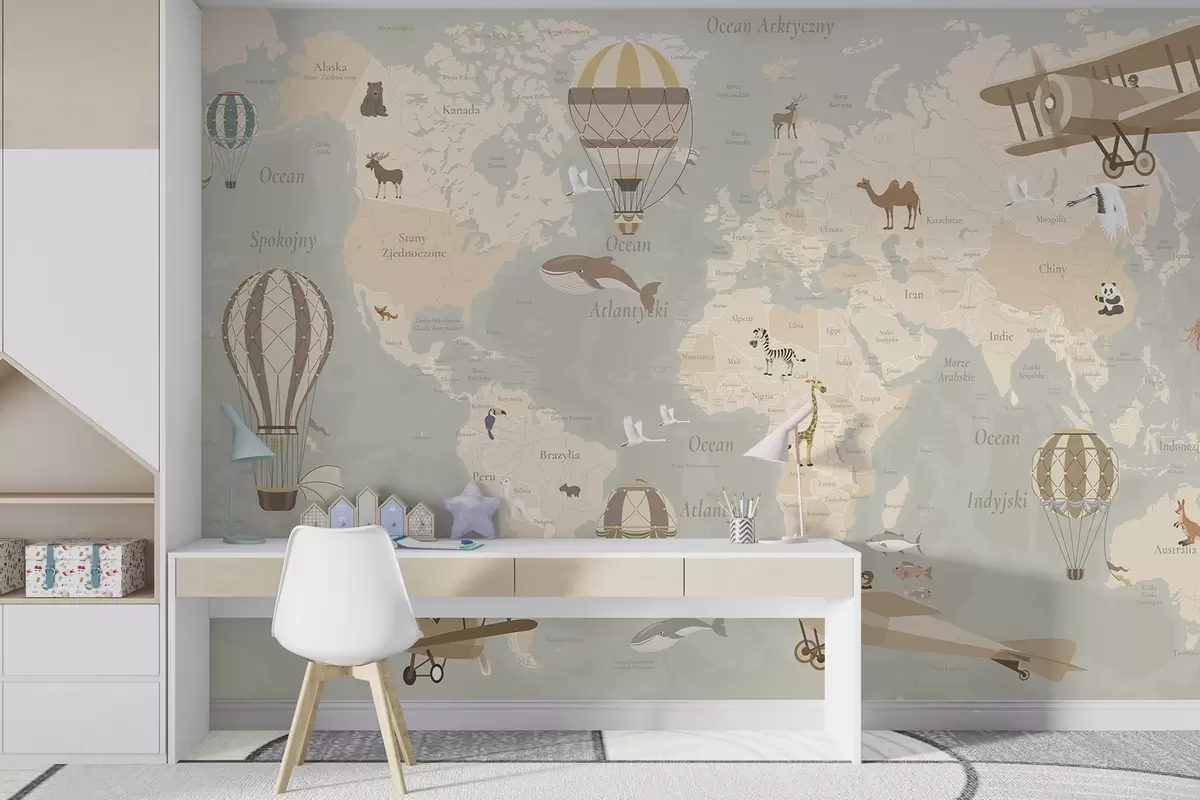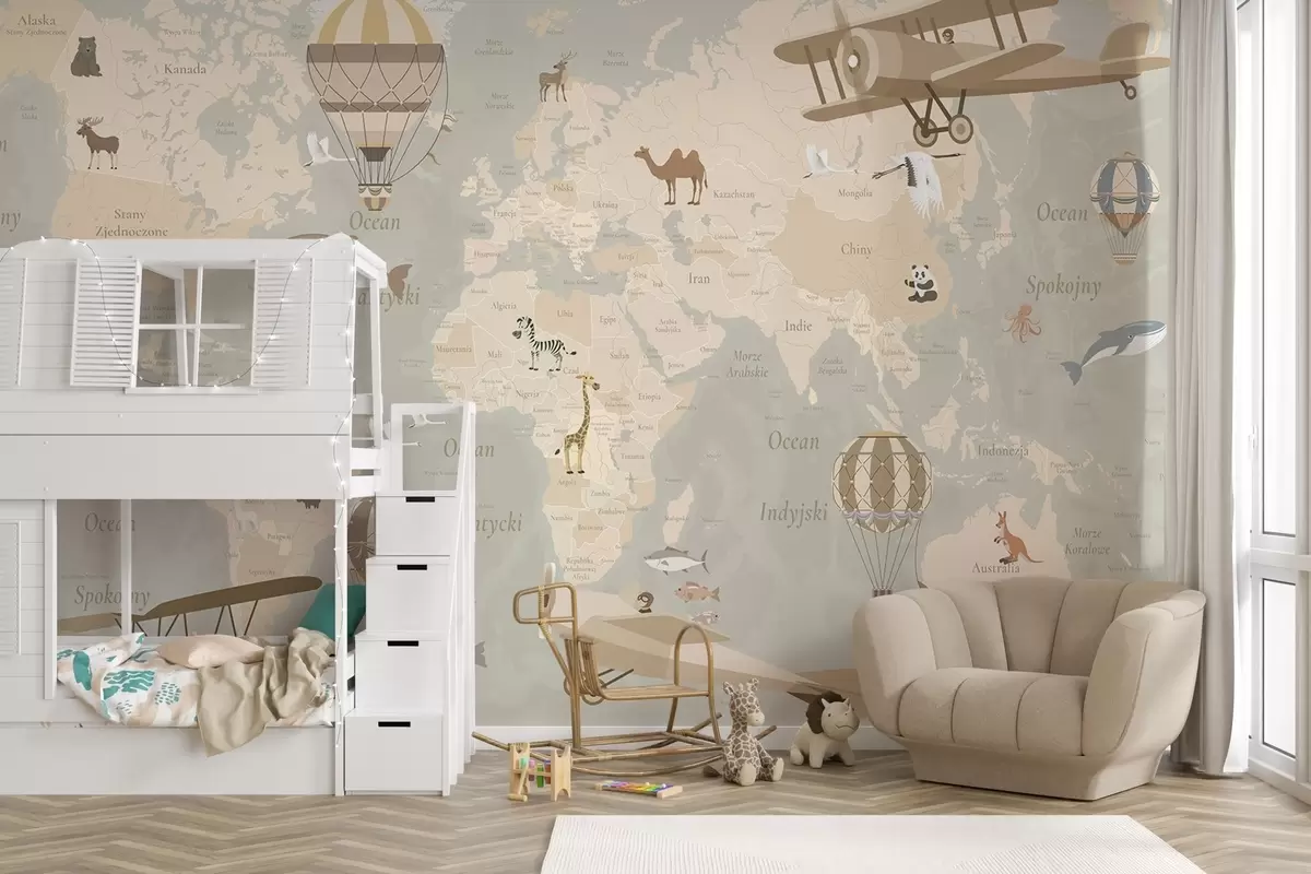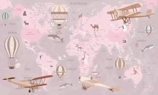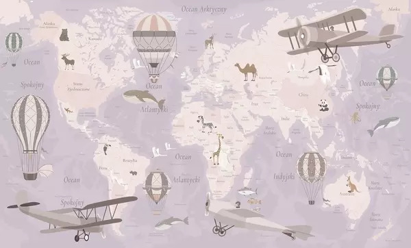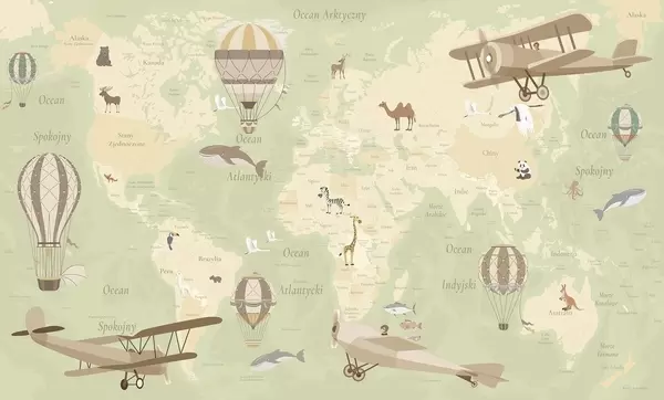 Fototapetak Gyerekeknek szóló világtérkép állatokkal, repülőgépekkel és hőlégballonokkal. Lengyel nyelvű. Bézs színű. Nr. c00003pl