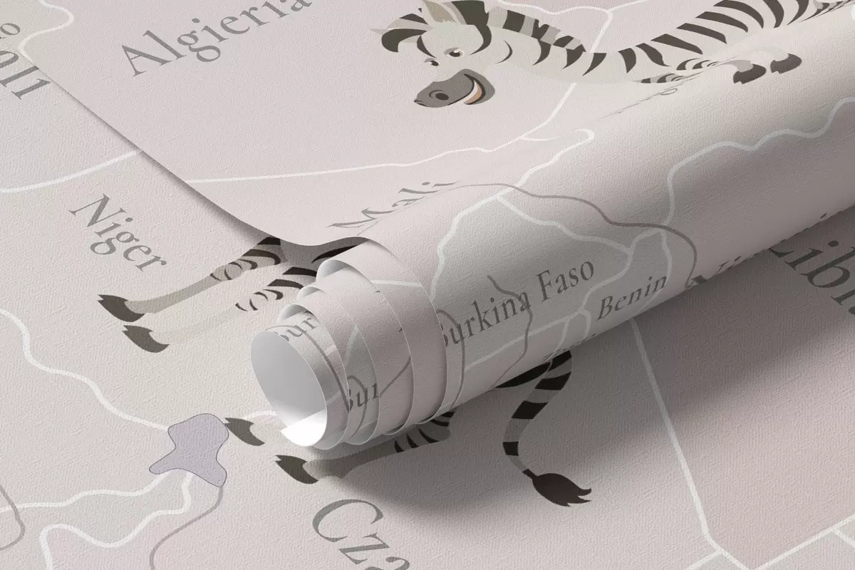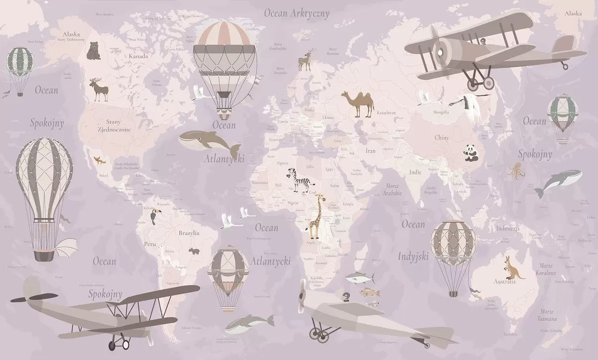 Fototapetak Gyerekeknek szóló világtérkép állatokkal, repülőgépekkel és hőlégballonokkal. Lengyel nyelv. Lila szín. Nr. c00003plv4