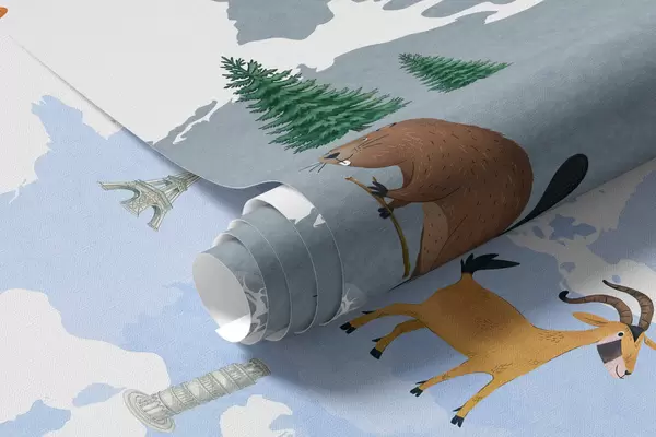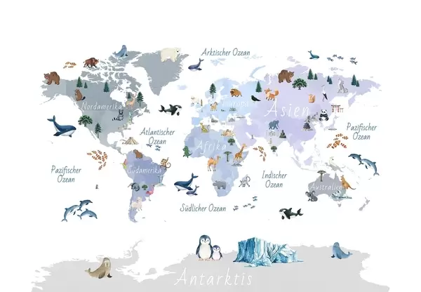 Fototapetak Akvarellszerű kék térkép állatokkal, növényekkel és építészeti elemekkel. Feliratok német nyelven Nr. c00009dev1
