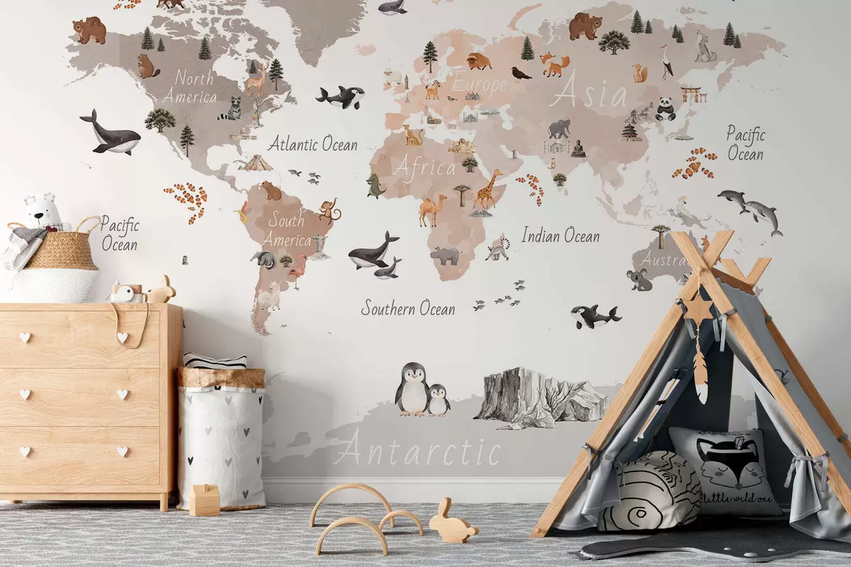 Fototapetak Akvarellszerű, bézs színű térkép állatokkal, növényekkel és építészeti elemekkel. Feliratok angolul Nr. c00009env3