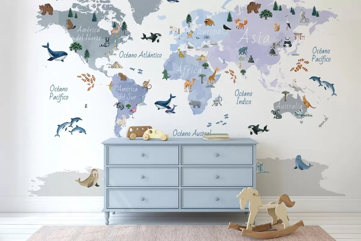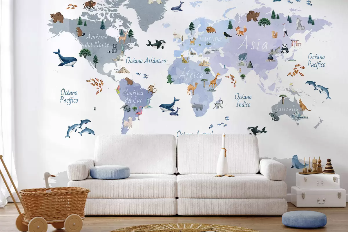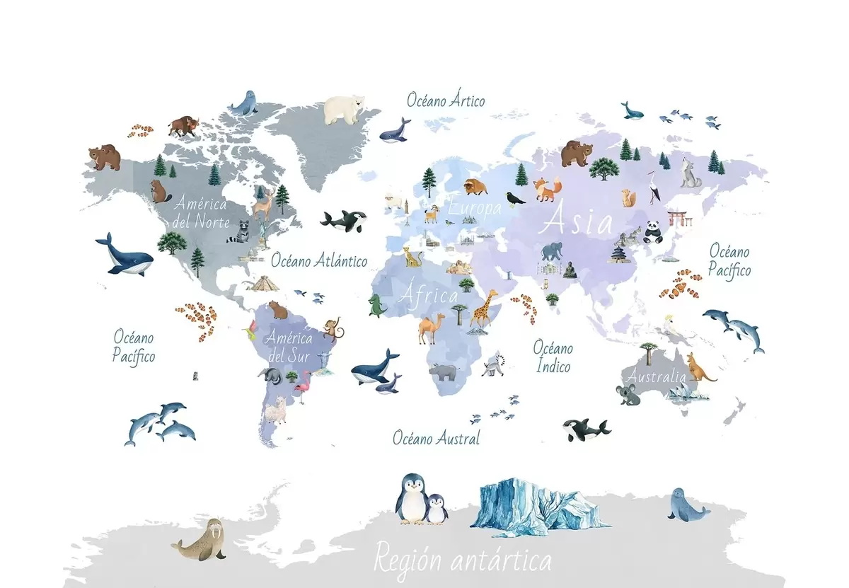 Fototapetak Akvarellszerű kék térkép állatokkal, növényekkel és építészeti elemekkel. Feliratok spanyol nyelven Nr. c00009esv1