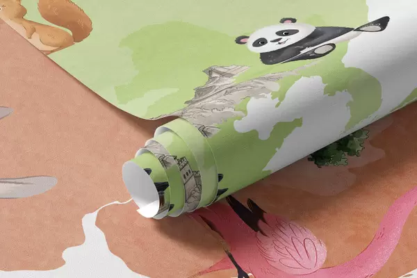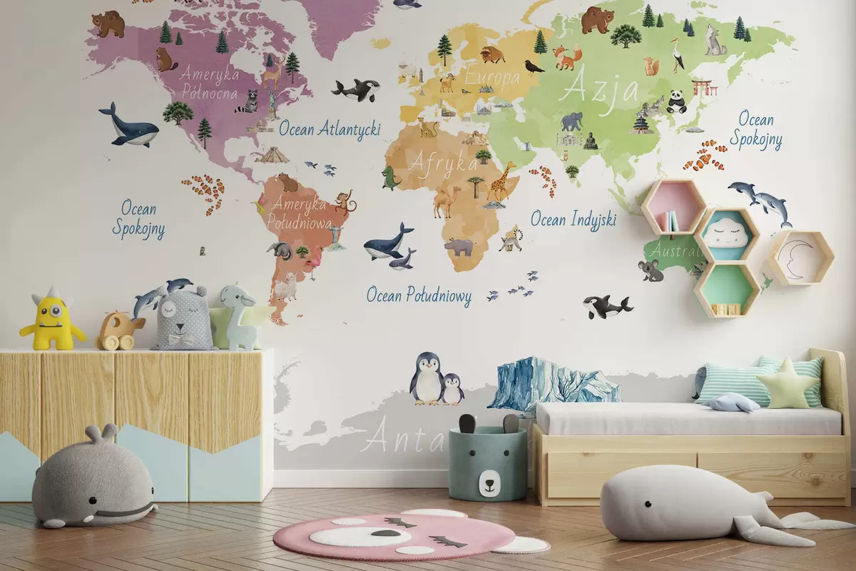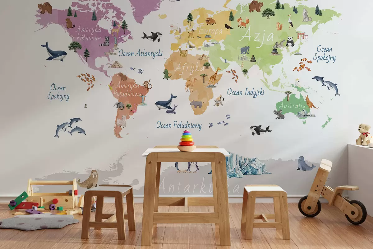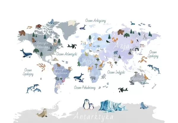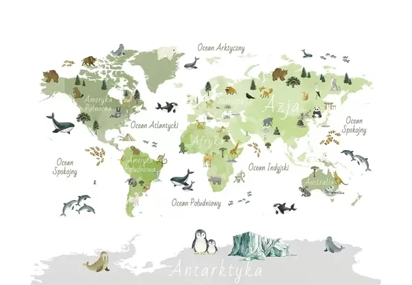 Fototapetak Akvarellszerű színes térkép állatokkal, növényekkel és építészeti elemekkel. Feliratok lengyel nyelven Nr. c00009pl