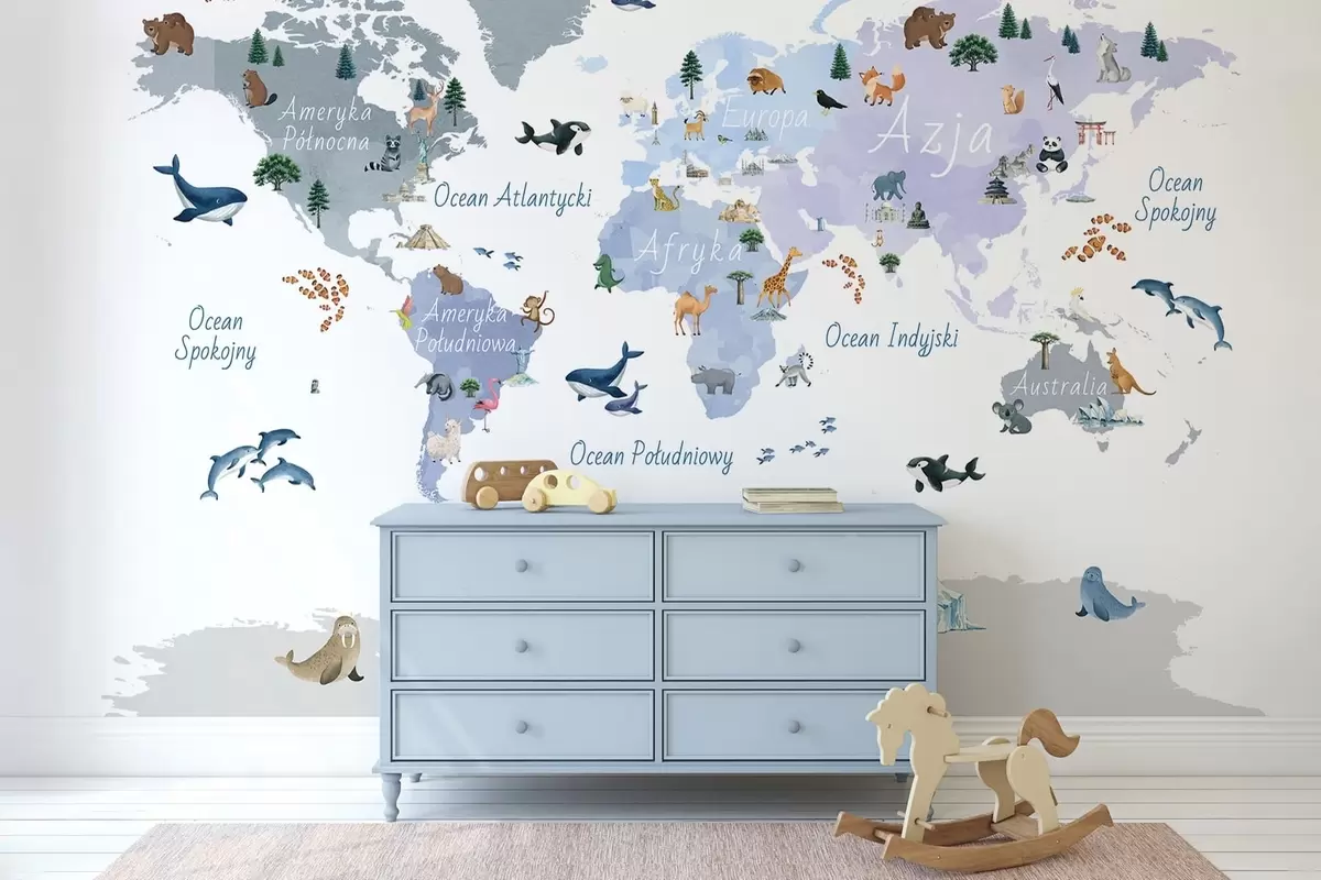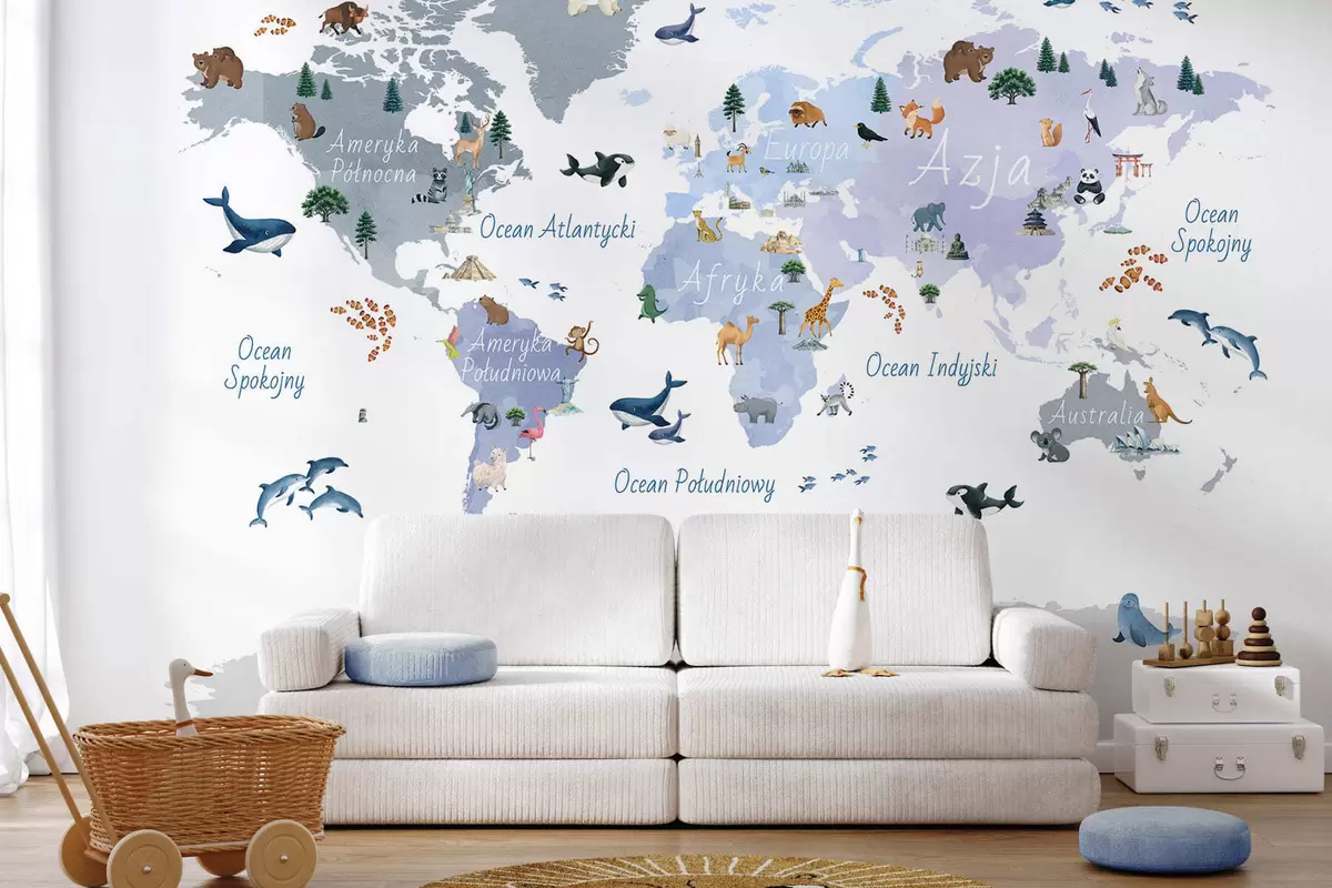 Fototapetak Akvarellszerű kék térkép állatokkal, növényekkel és építészeti elemekkel. Feliratok lengyel nyelven Nr. c00009plv1