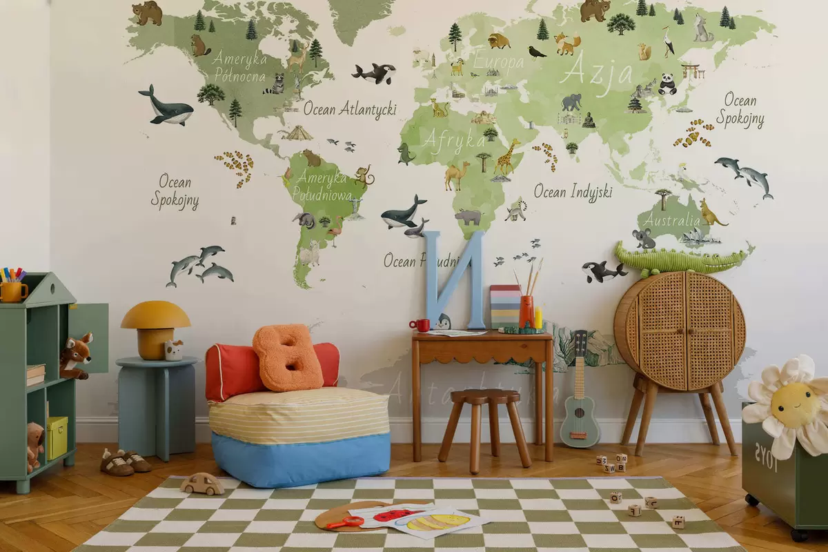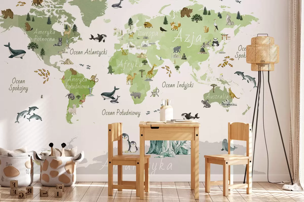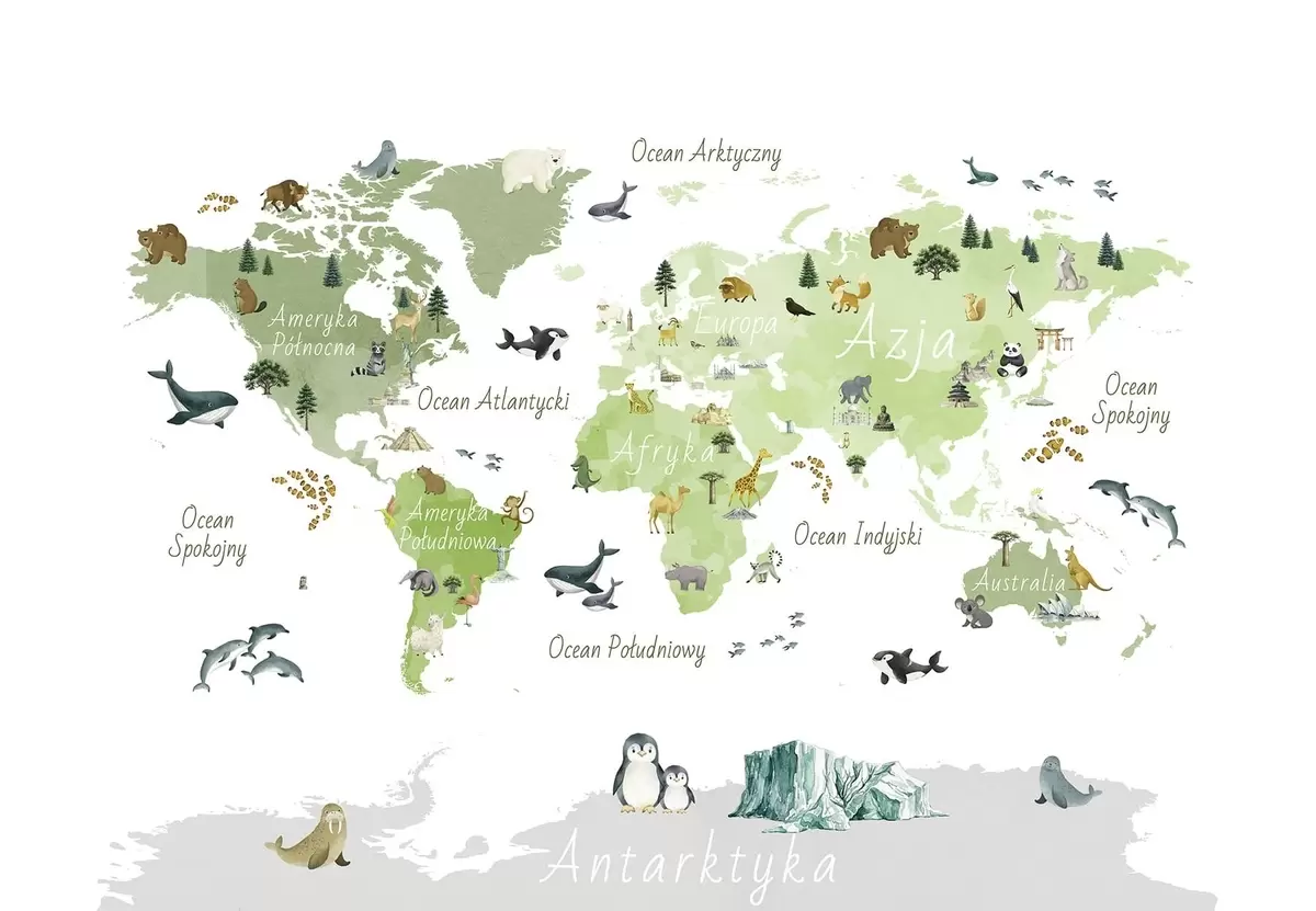Fototapetak Akvarellszerű zöld térkép állatokkal, növényekkel és építészeti elemekkel. Feliratok lengyel nyelven Nr. c00009plv2
