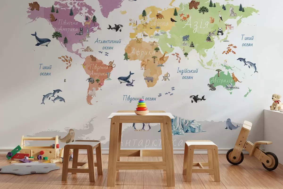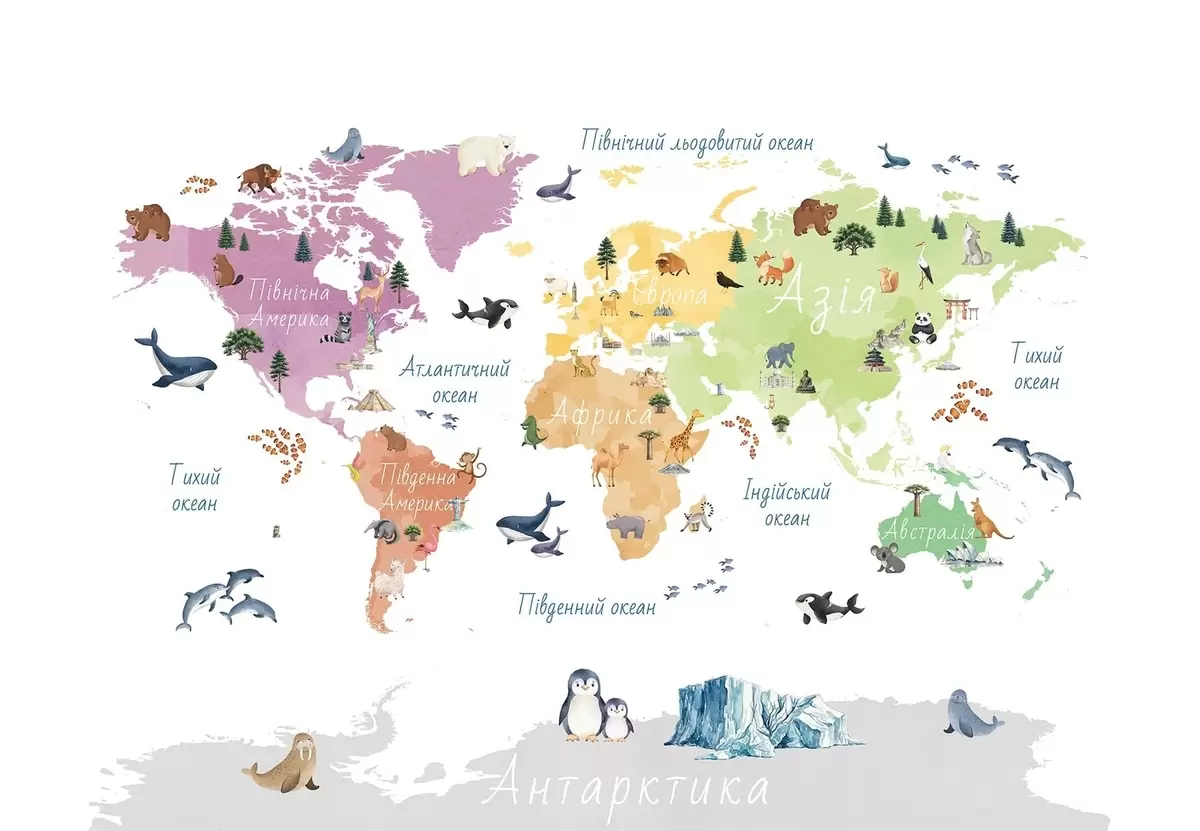 Fototapetak Akvarellszerű színes térkép állatokkal, növényekkel és építészeti elemekkel. Feliratok ukrán nyelven Nr. c00009uk