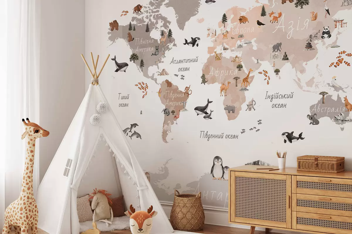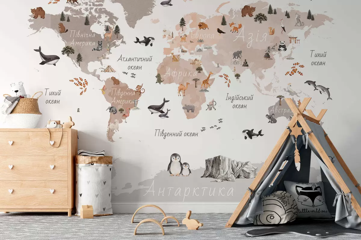 Fototapetak Akvarellszerű, bézs színű térkép állatokkal, növényekkel és építészeti elemekkel. Feliratok ukrán nyelven Nr. c00009ukv3