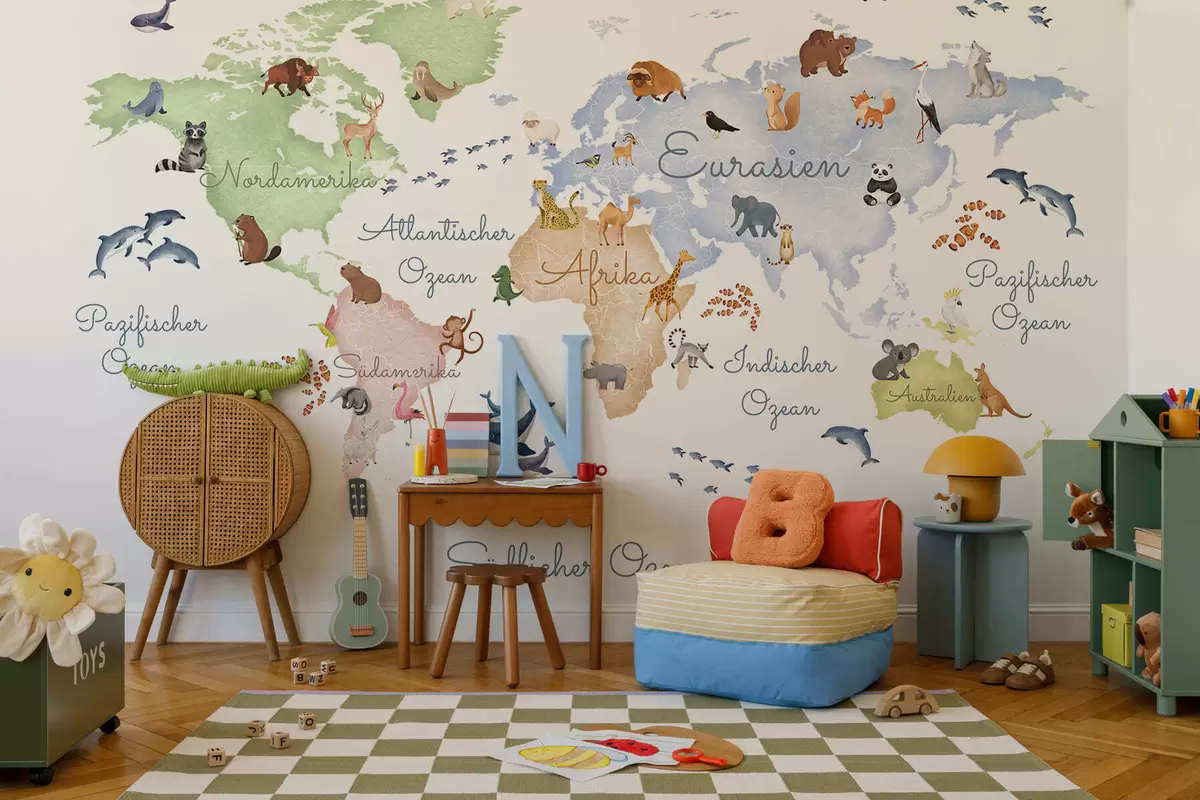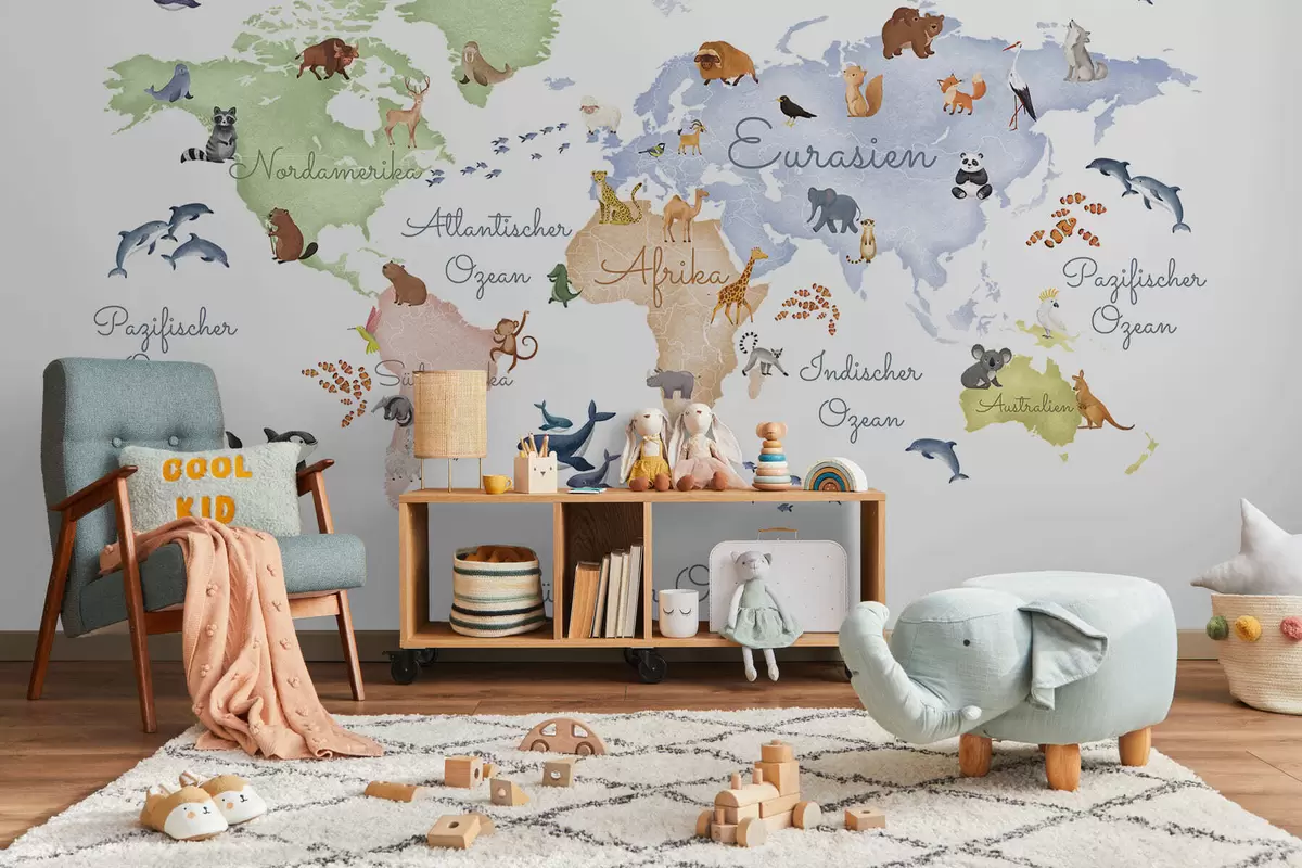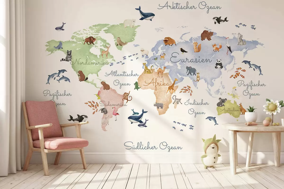 Fototapetak Állatokat ábrázoló, akvarell stílusú fehér térkép. Feliratok német nyelven Nr. c00012de