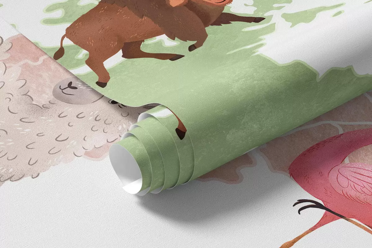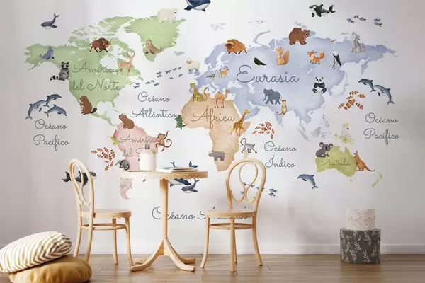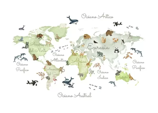 Fototapetak Állatokat ábrázoló, akvarell stílusú színes térkép. Feliratok spanyol nyelven Nr. c00012es