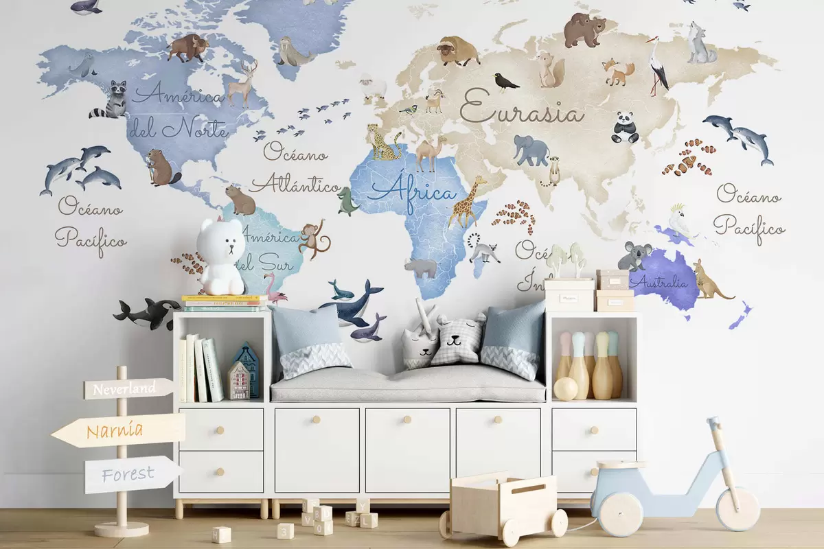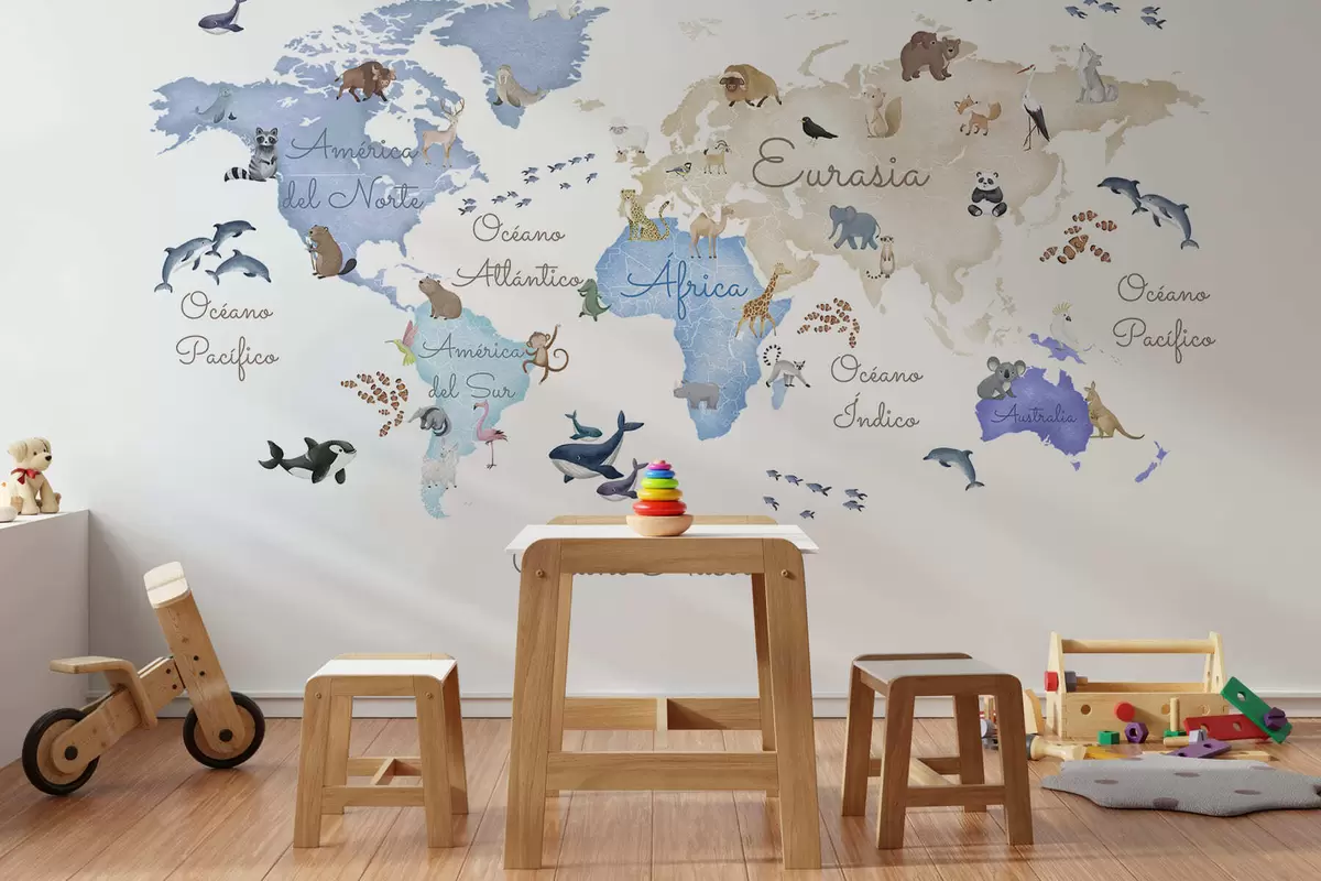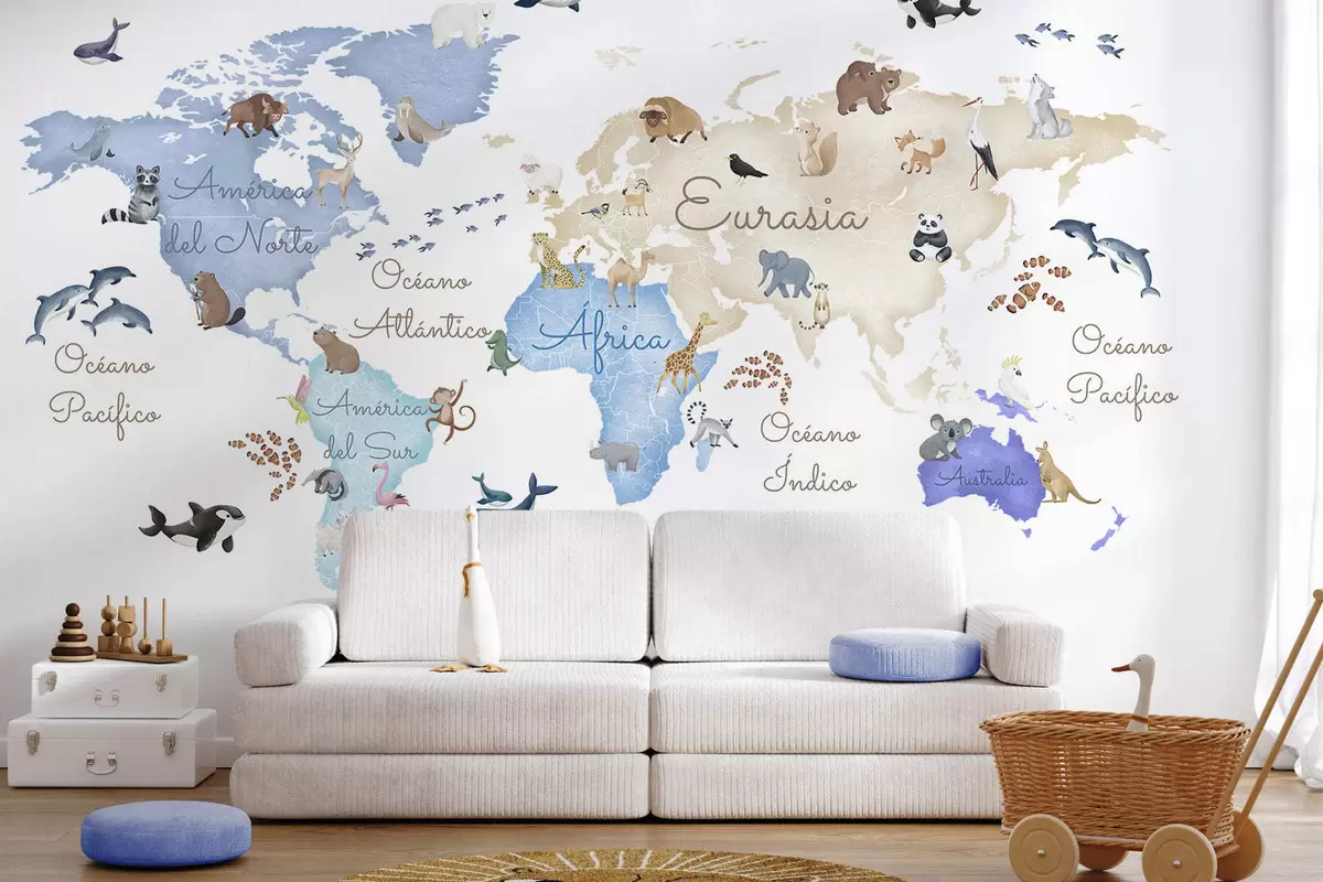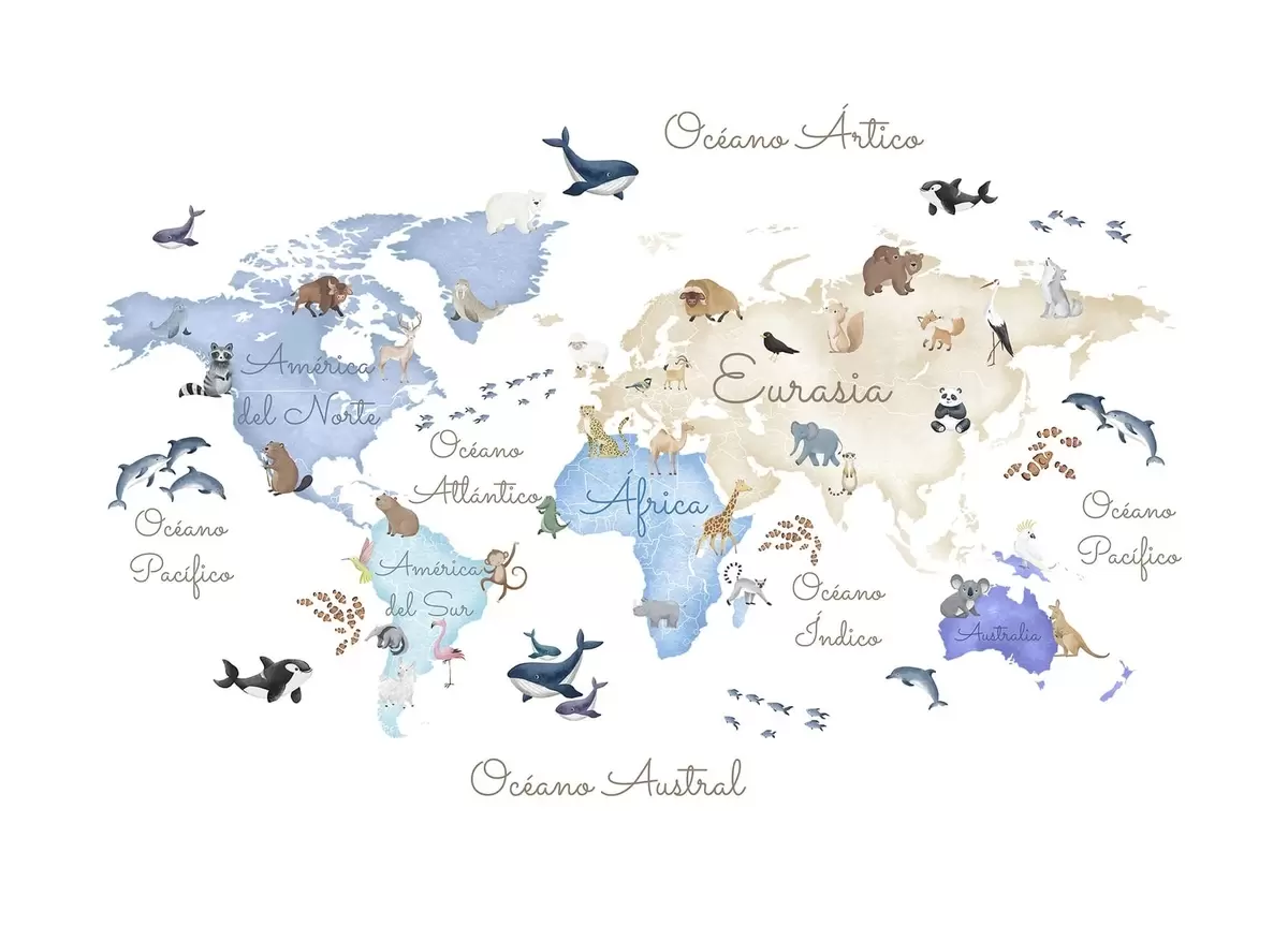 Fototapetak Állatokat ábrázoló, akvarell stílusú kék térkép. Feliratok spanyol nyelven Nr. c00012esv1