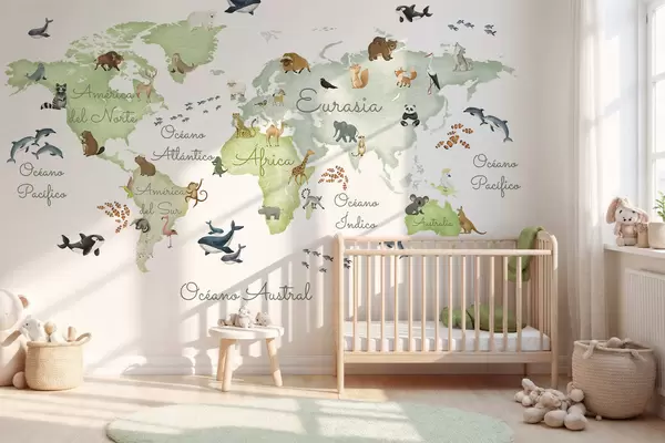 Fototapetak Állatokat ábrázoló, akvarell stílusú zöld térkép. Feliratok spanyol nyelven Nr. c00012esv2