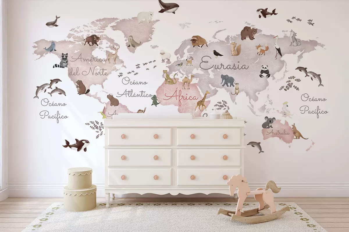 Fototapetak Állatokkal díszített, akvarell stílusú bézs színű térkép. Feliratok spanyol nyelven Nr. c00012esv3