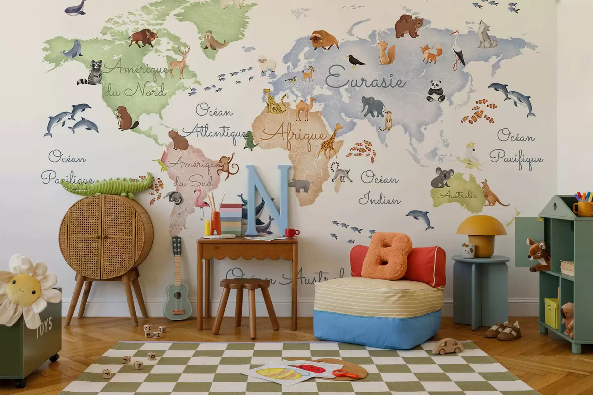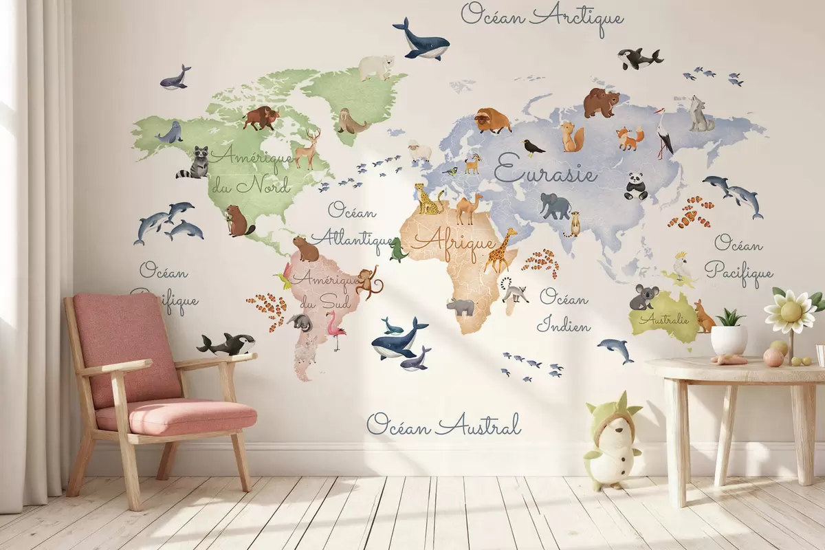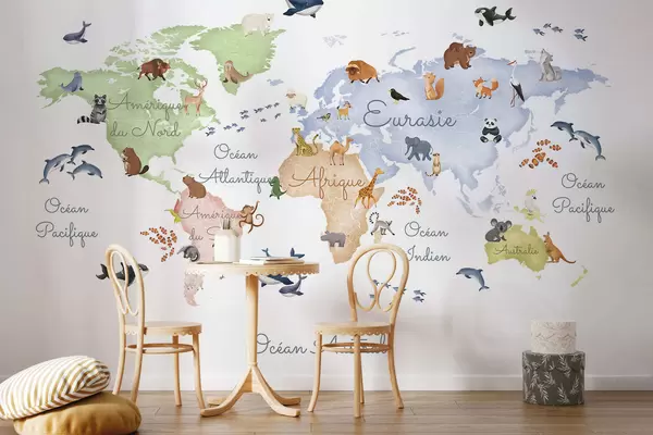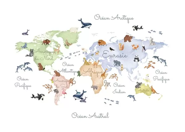 Fototapetak Állatokat ábrázoló, akvarell stílusú színes térkép. Feliratok franciául Nr. c00012fr