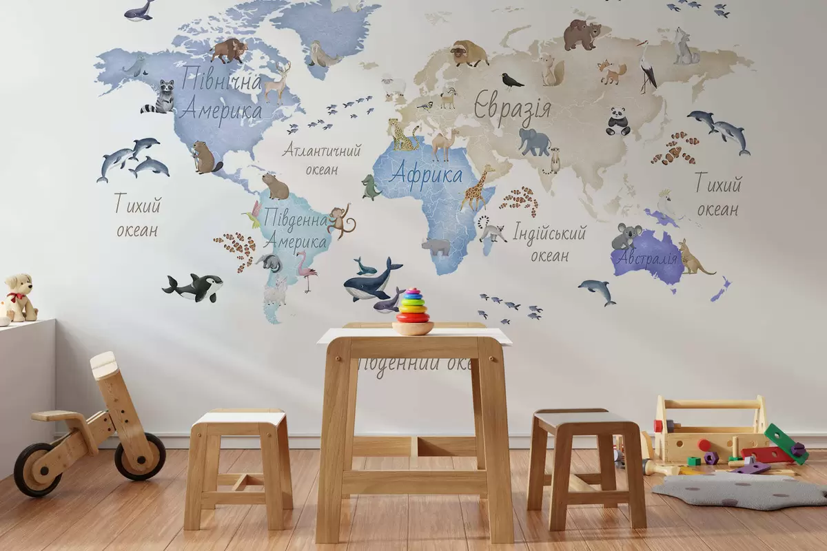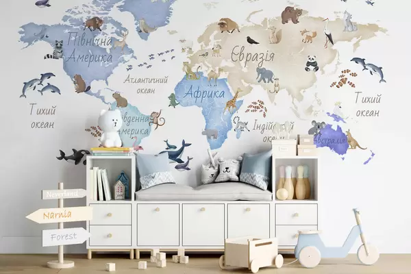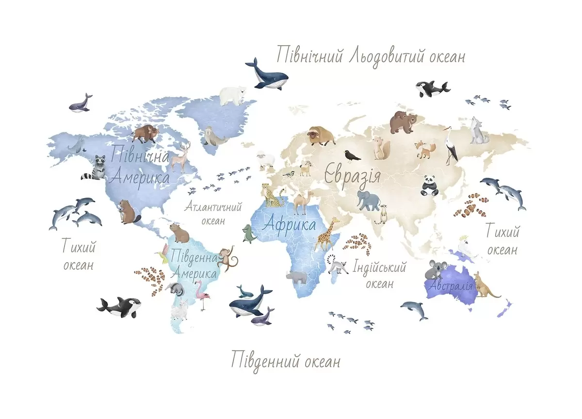 Fototapetak Állatokat ábrázoló, akvarell stílusú kék térkép. Feliratok ukrán nyelven Nr. c00012ukv1