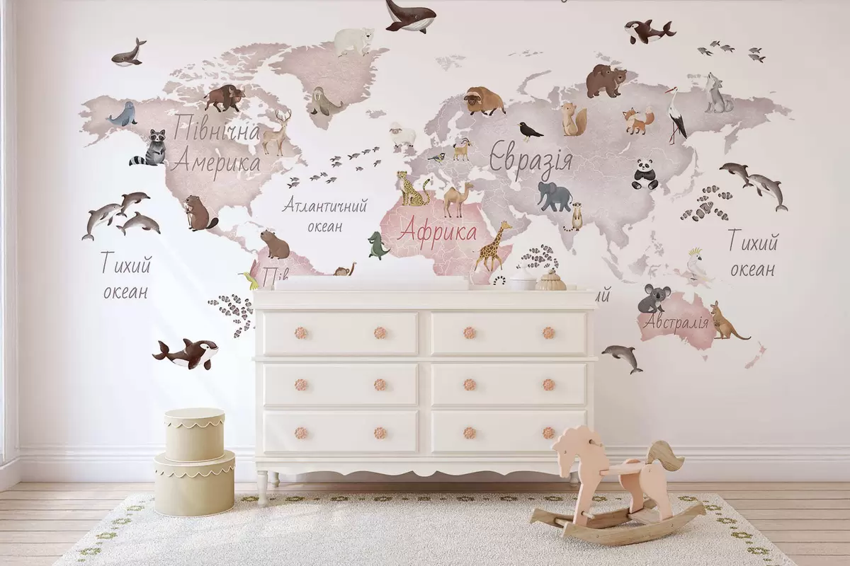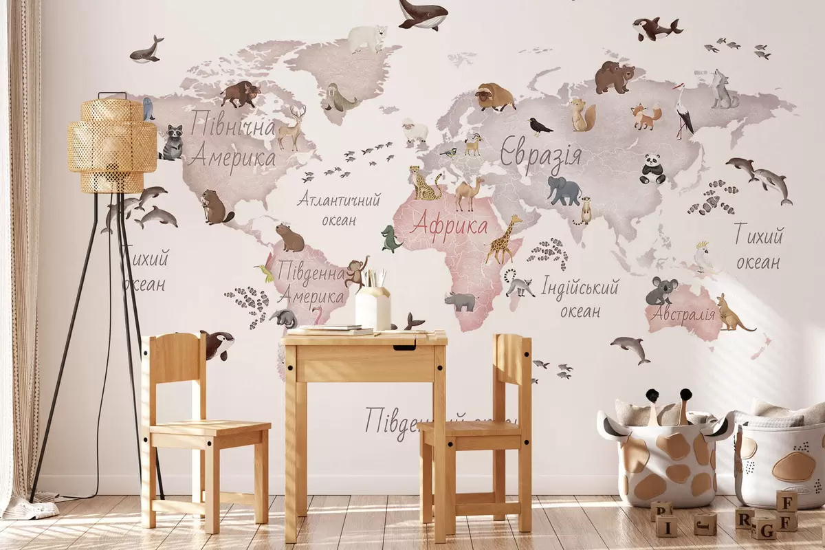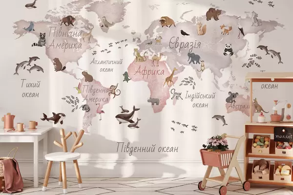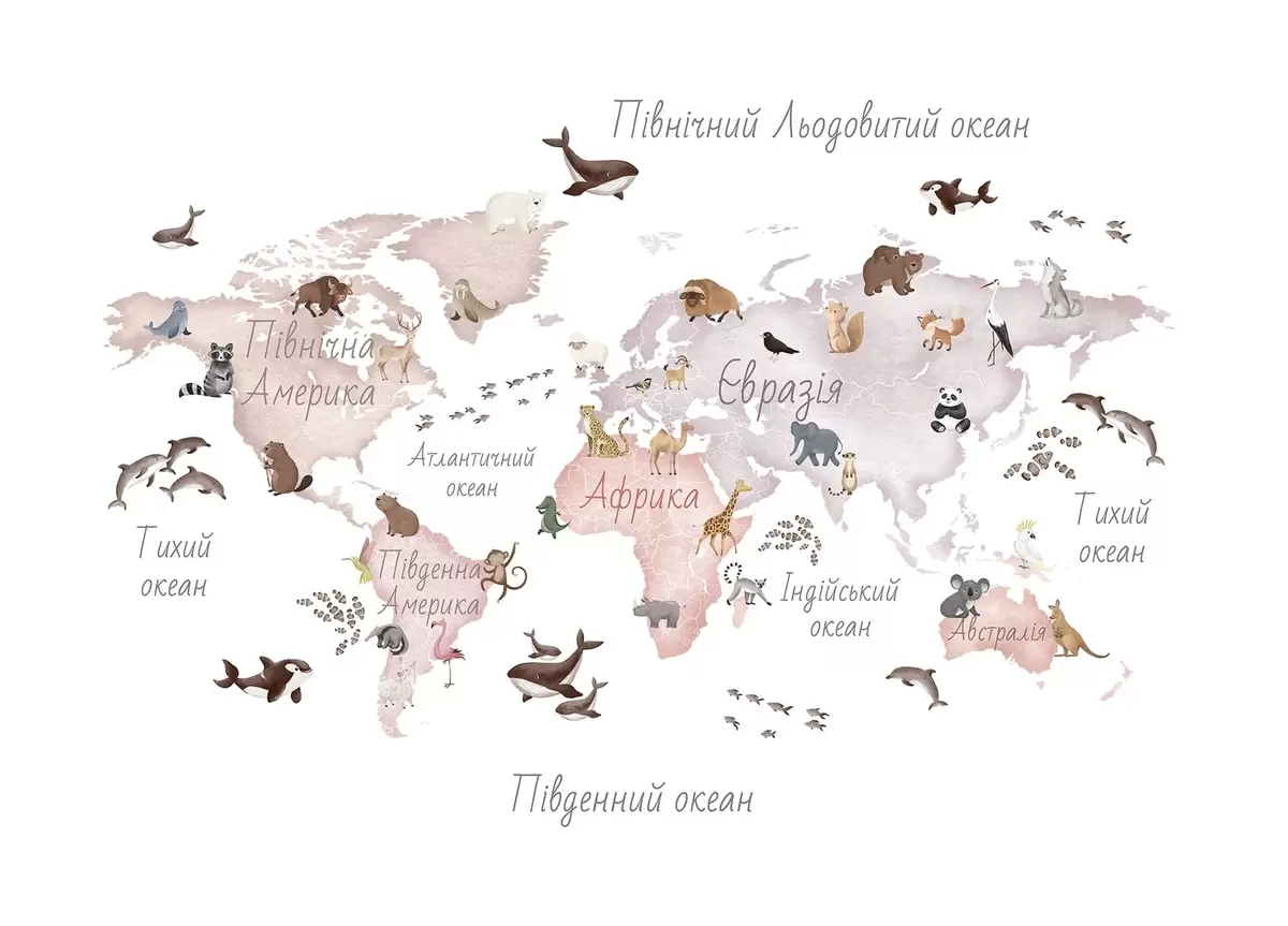 Fototapetak Állatokkal díszített, akvarell stílusú bézs színű térkép. Feliratok ukrán nyelven Nr. c00012ukv3