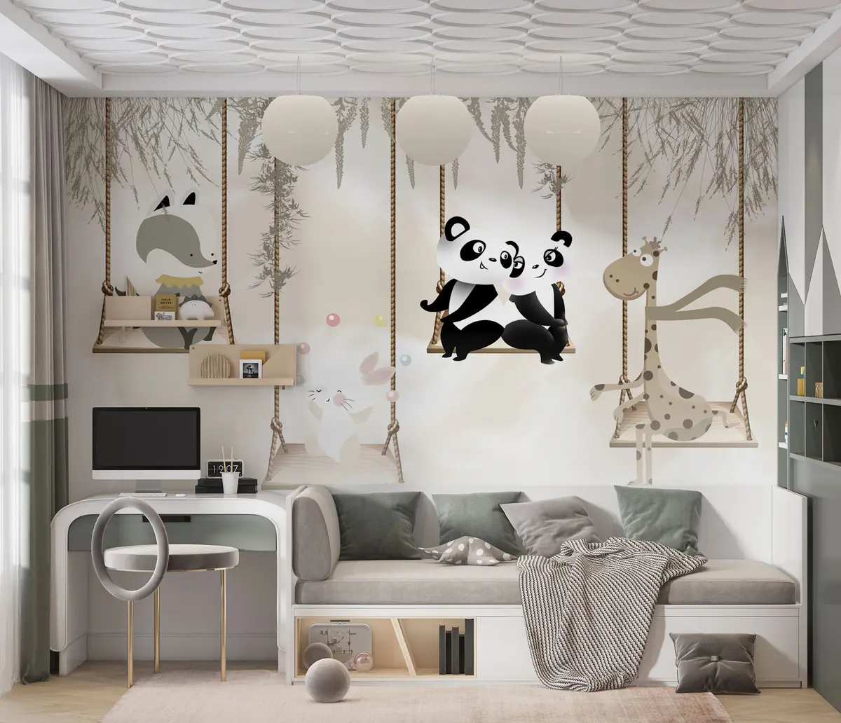 Fototapetak Tapéta design gyerekszobába zsiráf, mosómedve, nyúl és pandák a hintán Nr. u98972