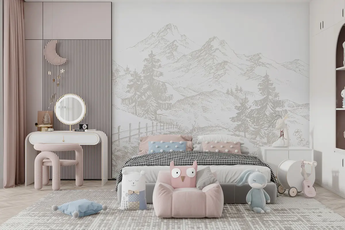 Fototapetak Hegyek táj, vonalrajz, fák, minimalizmus, bézs színek, bézs színek Nr. u99572