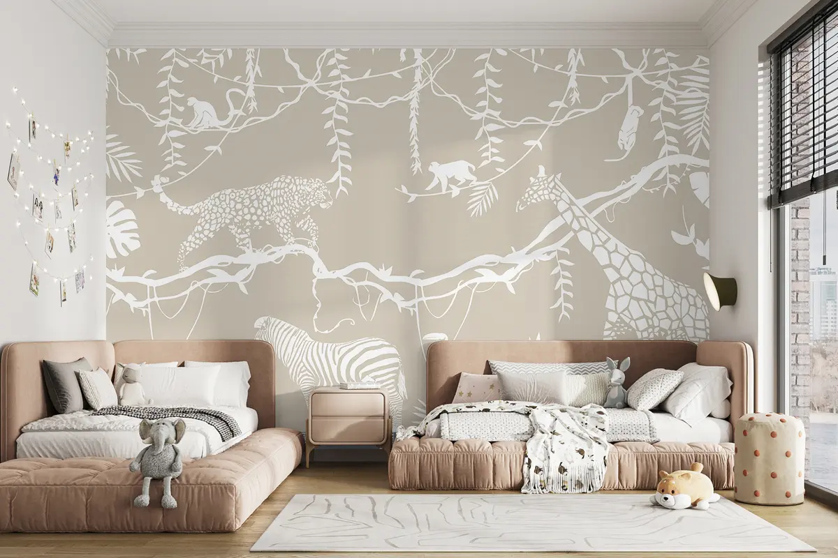 Fototapetak Absztrakt dzsungel művészet, liánok, leopárd, zsiráf, majmok, pálmafák, monstera, bézs és fehér Nr. w00087