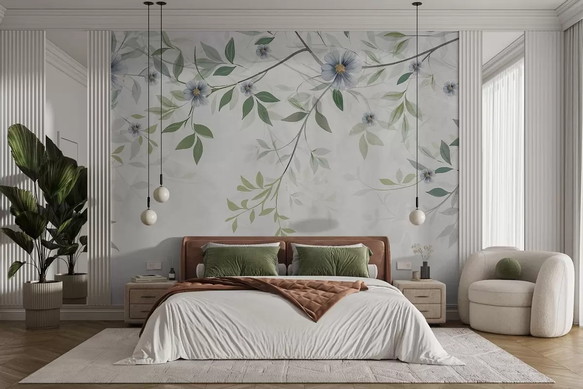 Fototapetak Zöld levelű ágak és kék virágok Nr. w00316