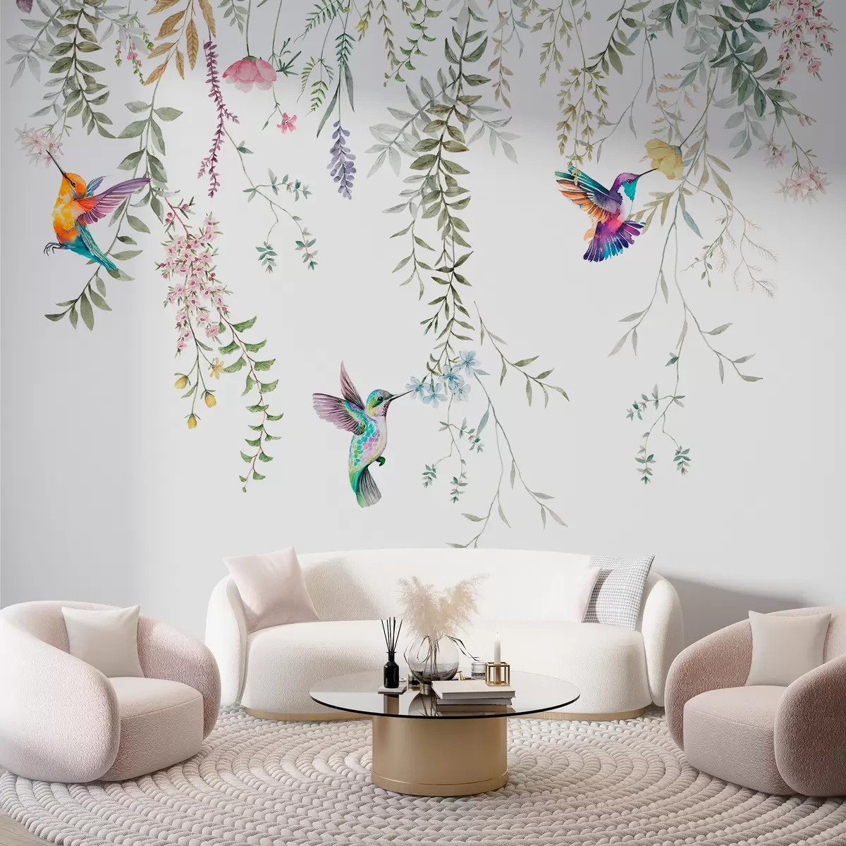 Fototapetak Lógó virágok és levelek és gyönyörű kolibri Nr. w00660