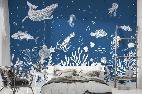 Fototapetak Tengeri élet, hal, bálna, polip, medúza, korallok, tengeri élőlények, sötétkék szín Nr. w00850v4