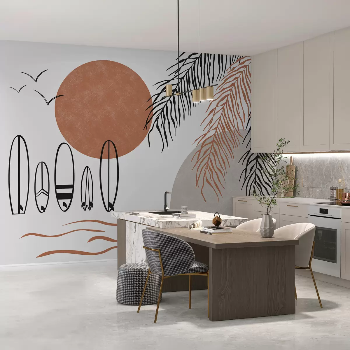Fototapetak Szörfdeszkák, pálmaágak vonalrajza, fekete és piros színben Nr. w00958