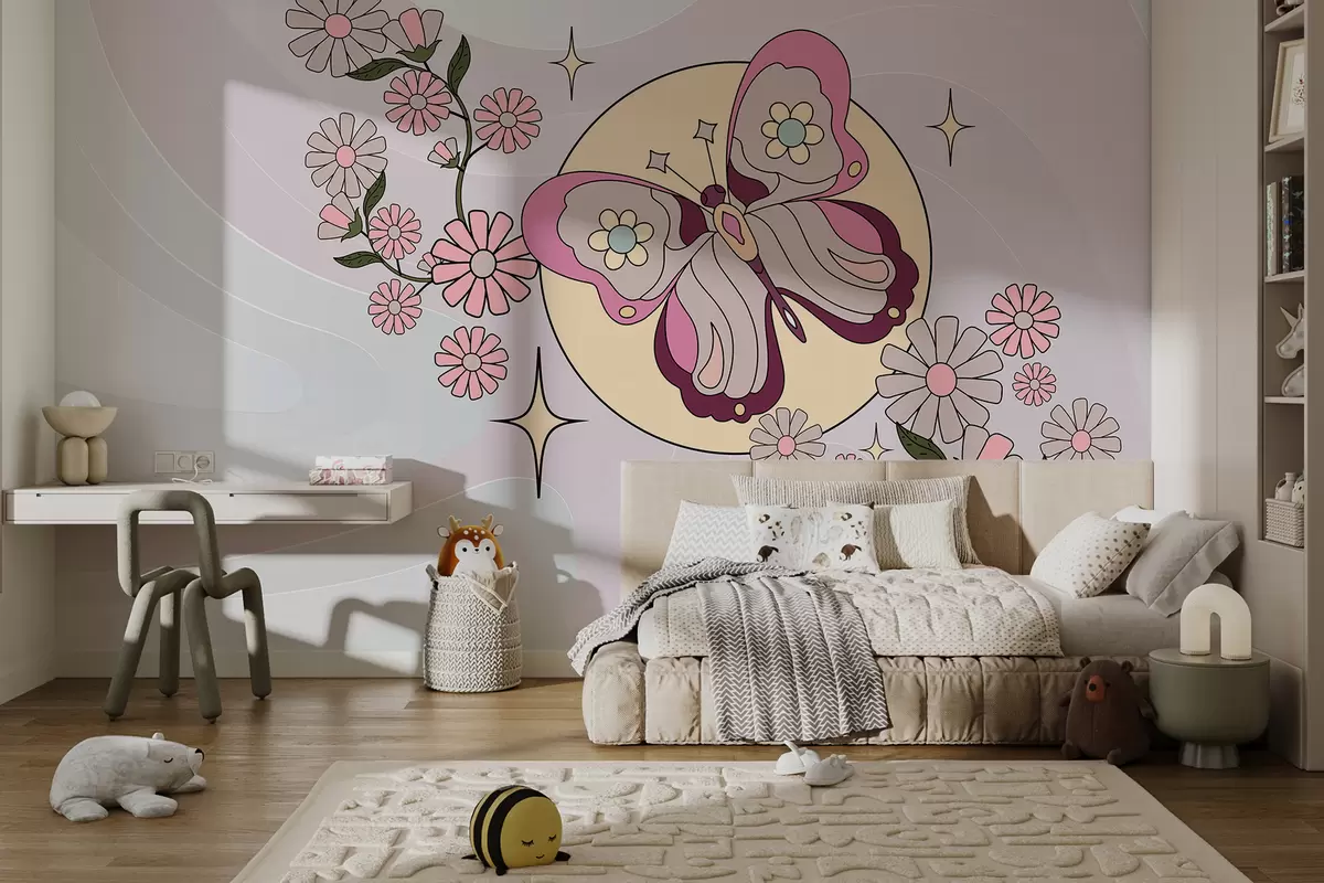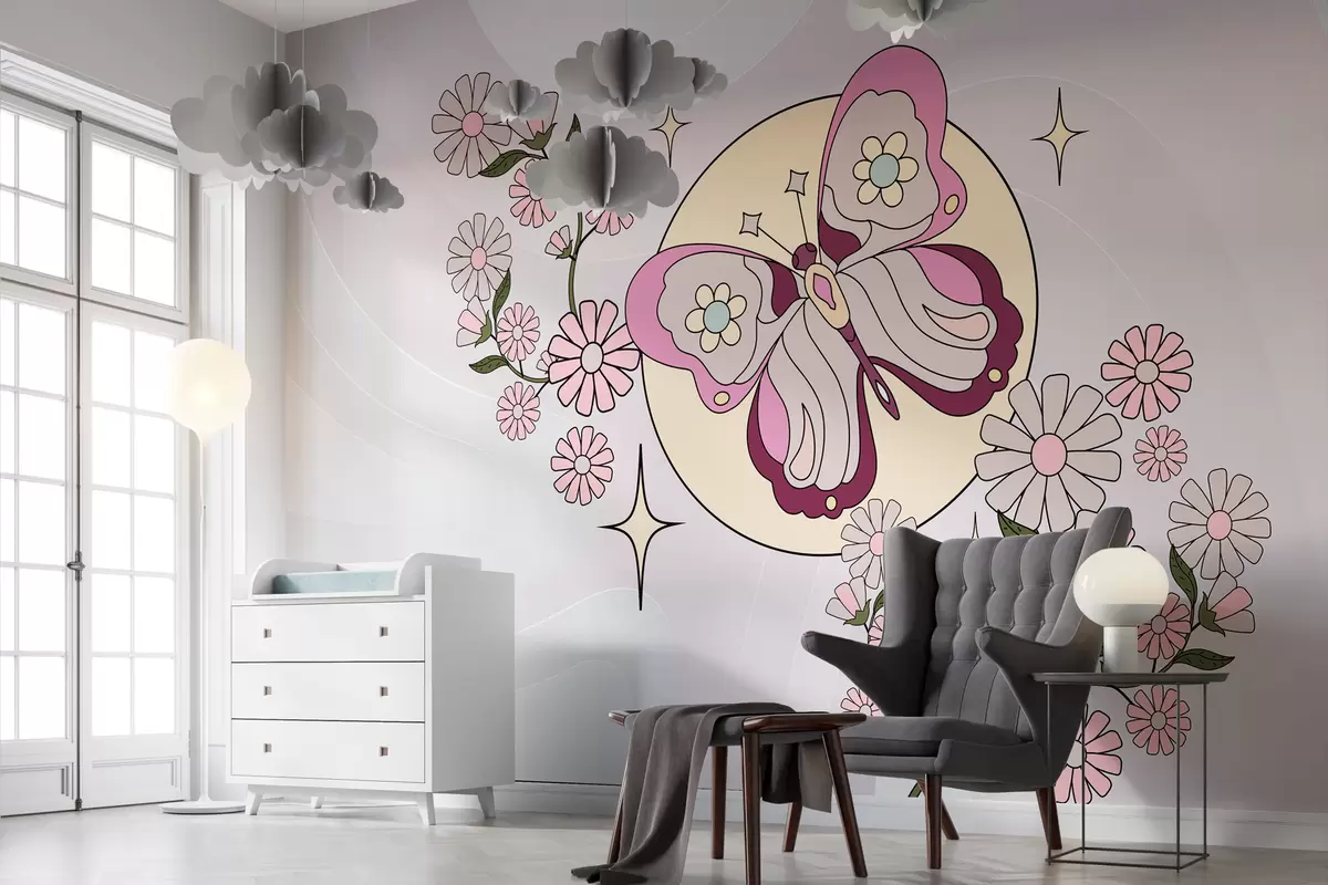 Fototapetak tapéta rózsaszín pillangóval világosszürke-rózsaszín alapon virágok között egyszerű stílusban egy lányszobába Nr. w00985