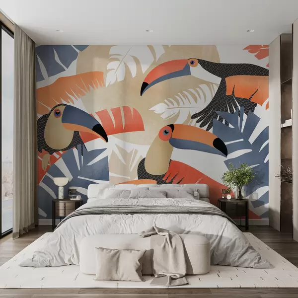 Fototapetak Trópusi levelű tukánok, kék, piros, narancssárga színben Nr. w01008